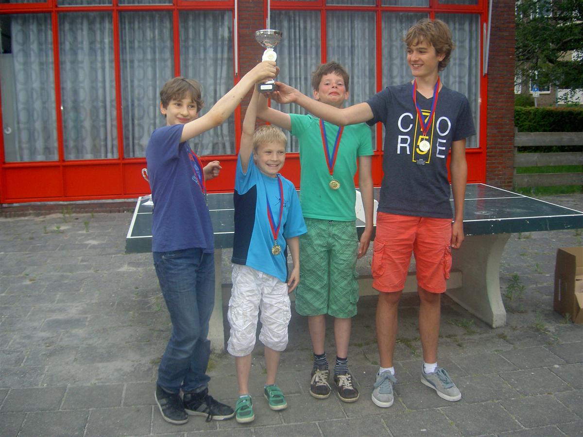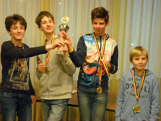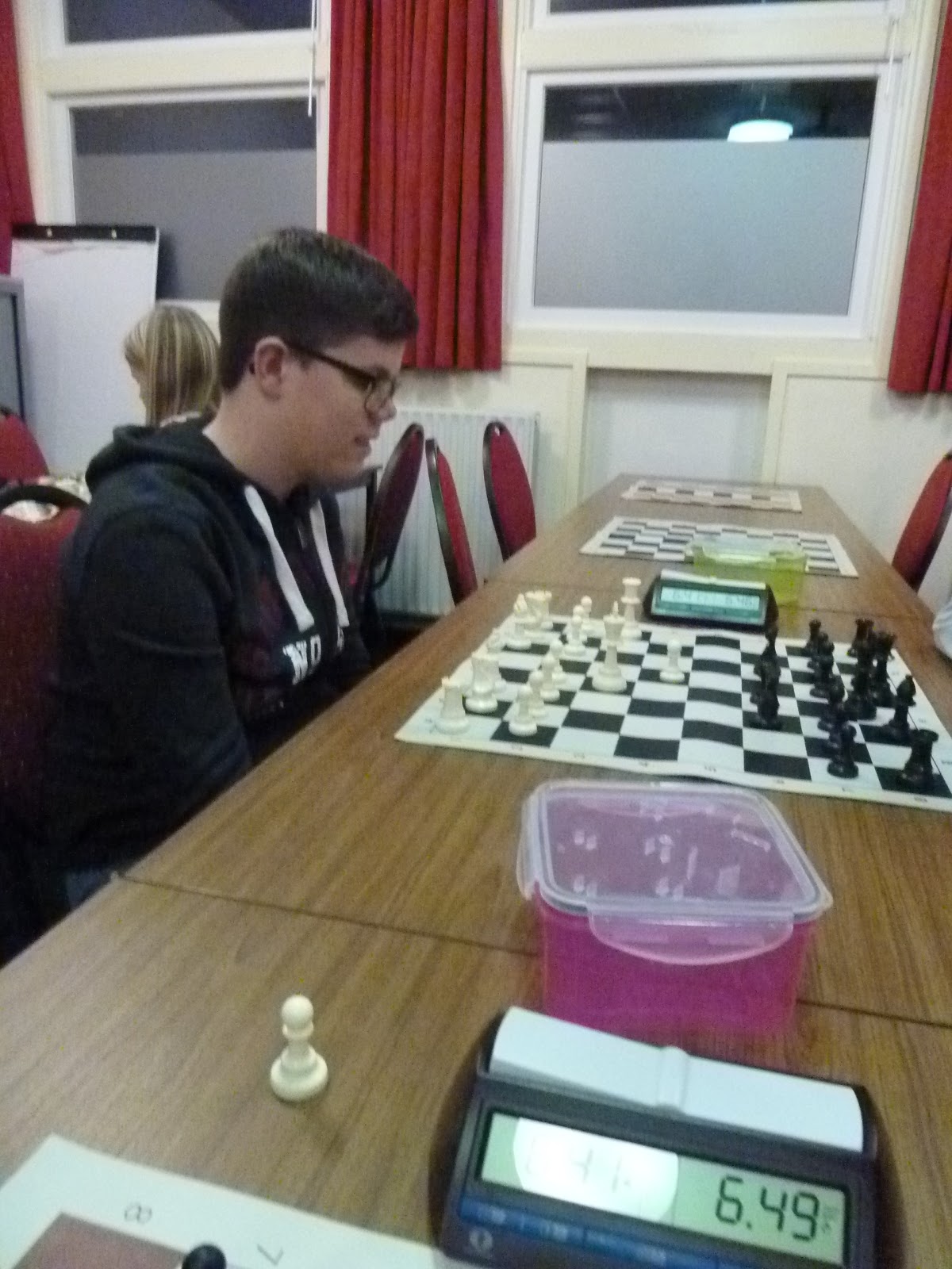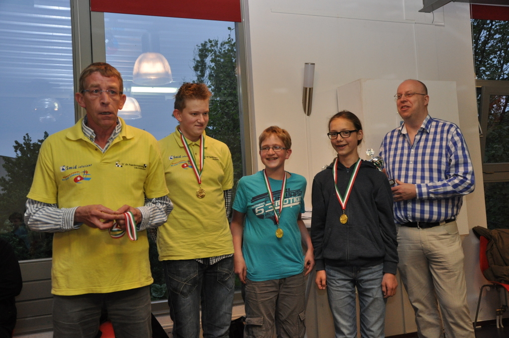 Rowin deed het een treetje lager ook uitstekend. Hij won al zijn partijen behalve tegen clubgenoot Jan. Jan bleek gewoon te hoog ingedeeld te zijn. Jan heeft veel talent en veel geleerd zaterdagmiddag. En hij was als enige in staat om Rowin een half punt af te snoepen. Rowin natuurlijk van harte gefeliciteerd met je eerste plaats.