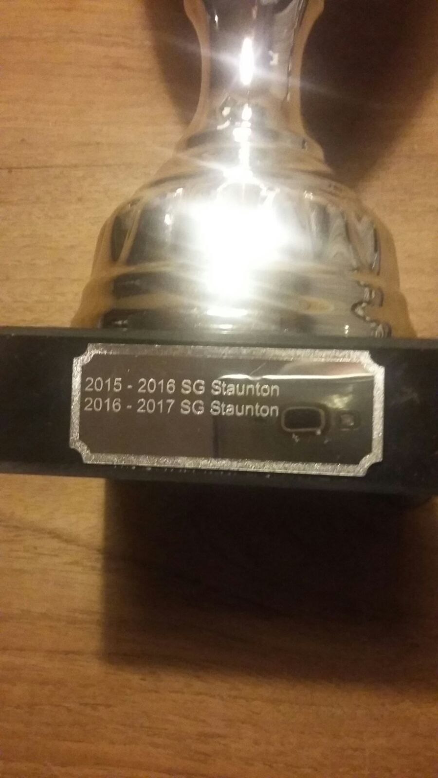 Ook steunpilaar Ronald is blij. Zo blij dat hij besluit om naamplaatjes te maken. Wat blijkt namelijk: er staat maar één winnaar op de beker: SC de Paardensprong. Ronald laat op kosten van hemzelf twee plaatjes maken met alleen maar Staunton er op. Alleen de jaartallen verschillen. Misschien had wel volstaan om één vermelding te maken: 2014-2017 Staunton. Scheelt ruimte in de toekomst.