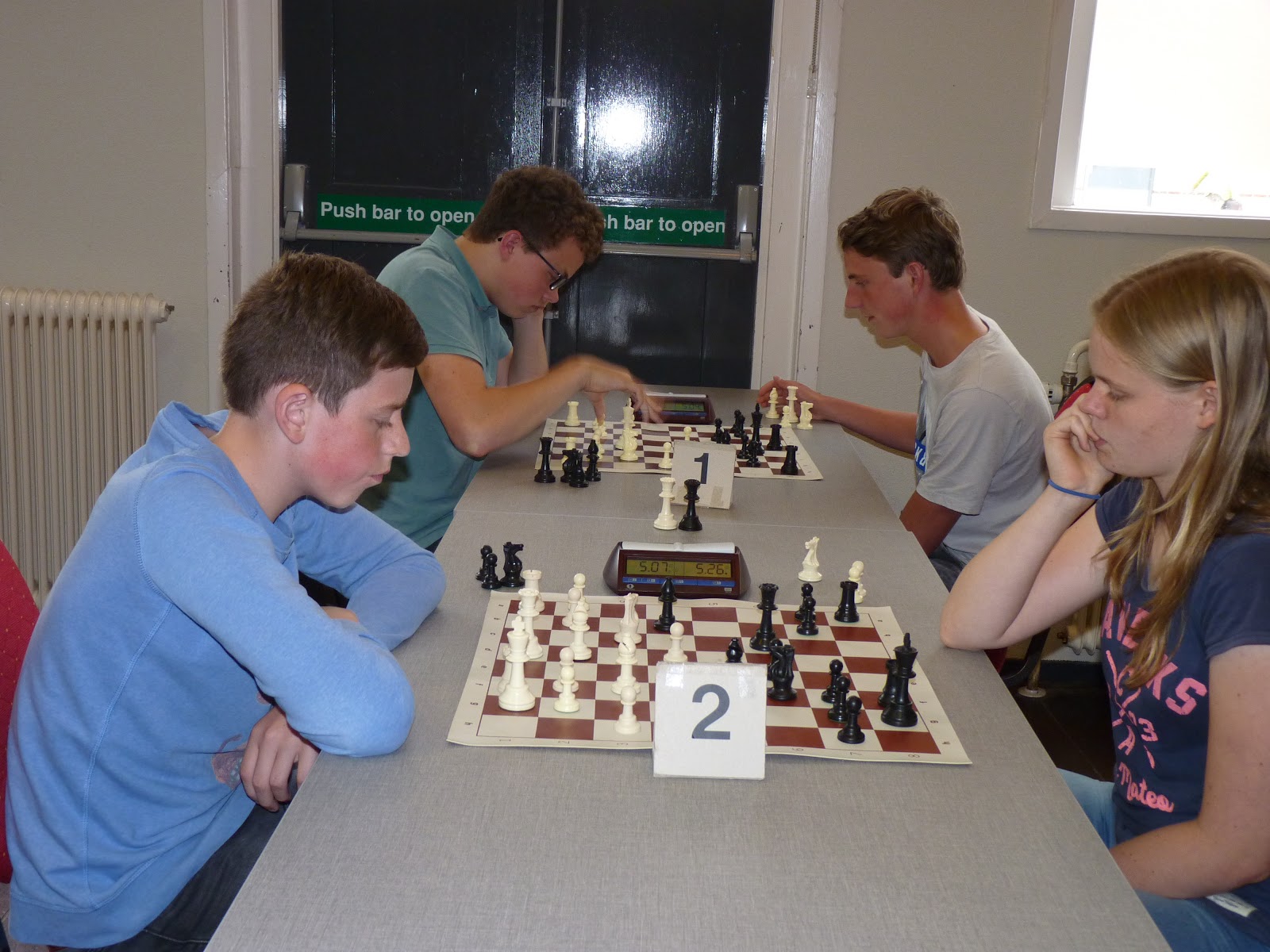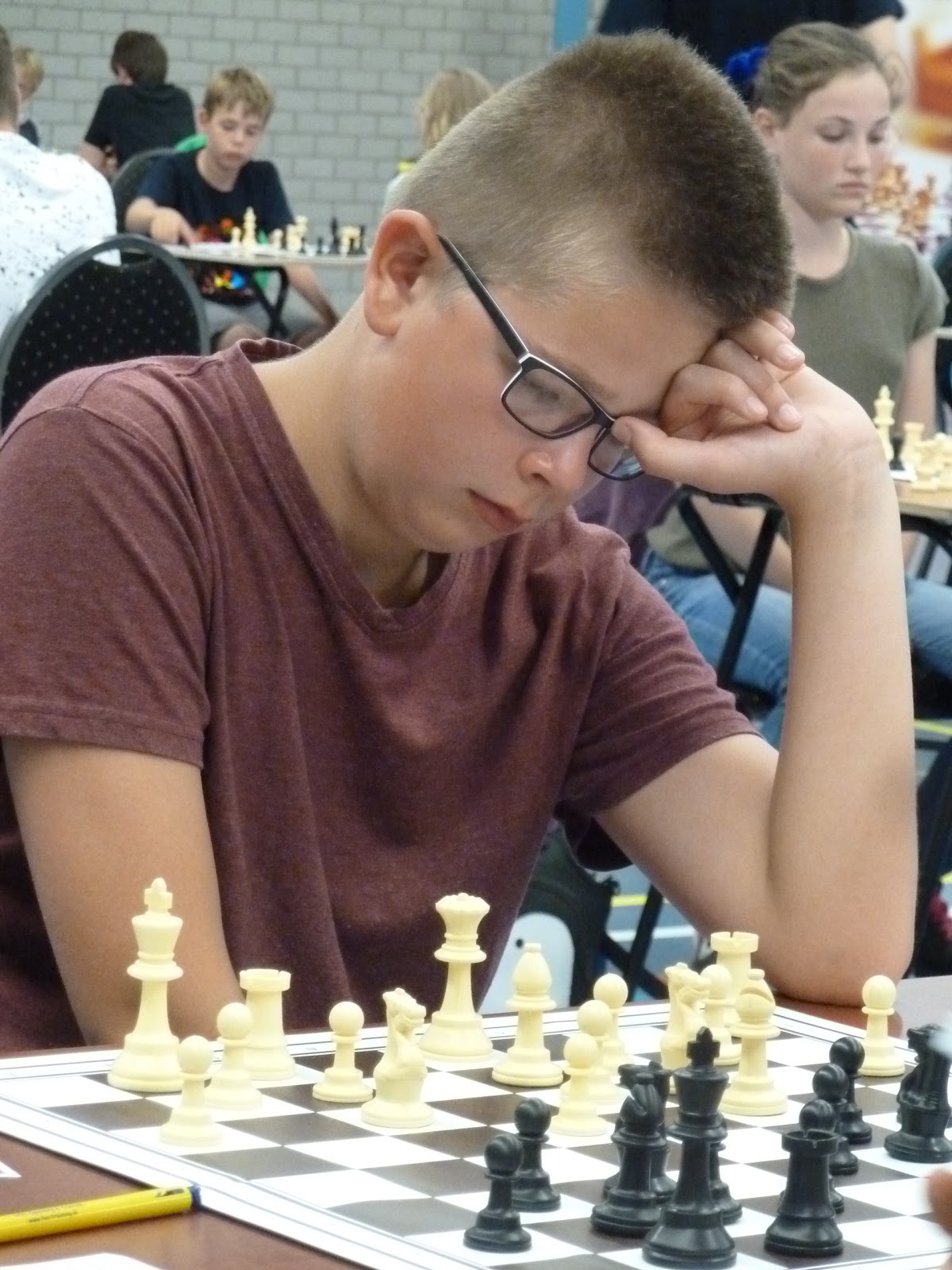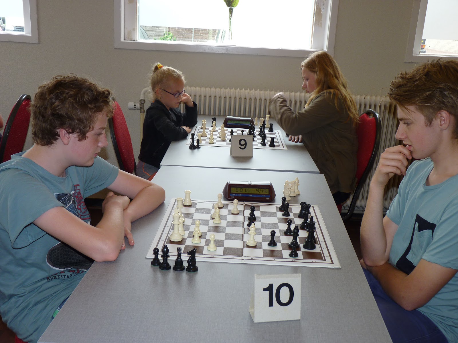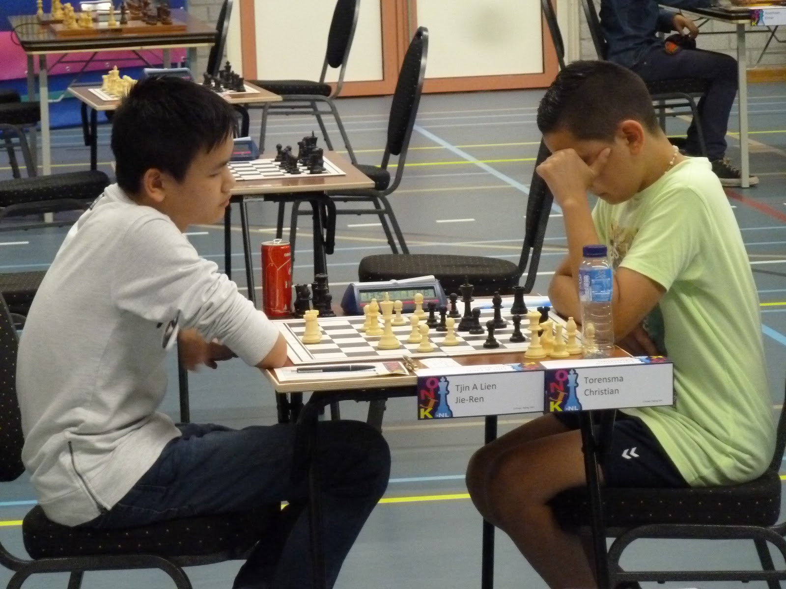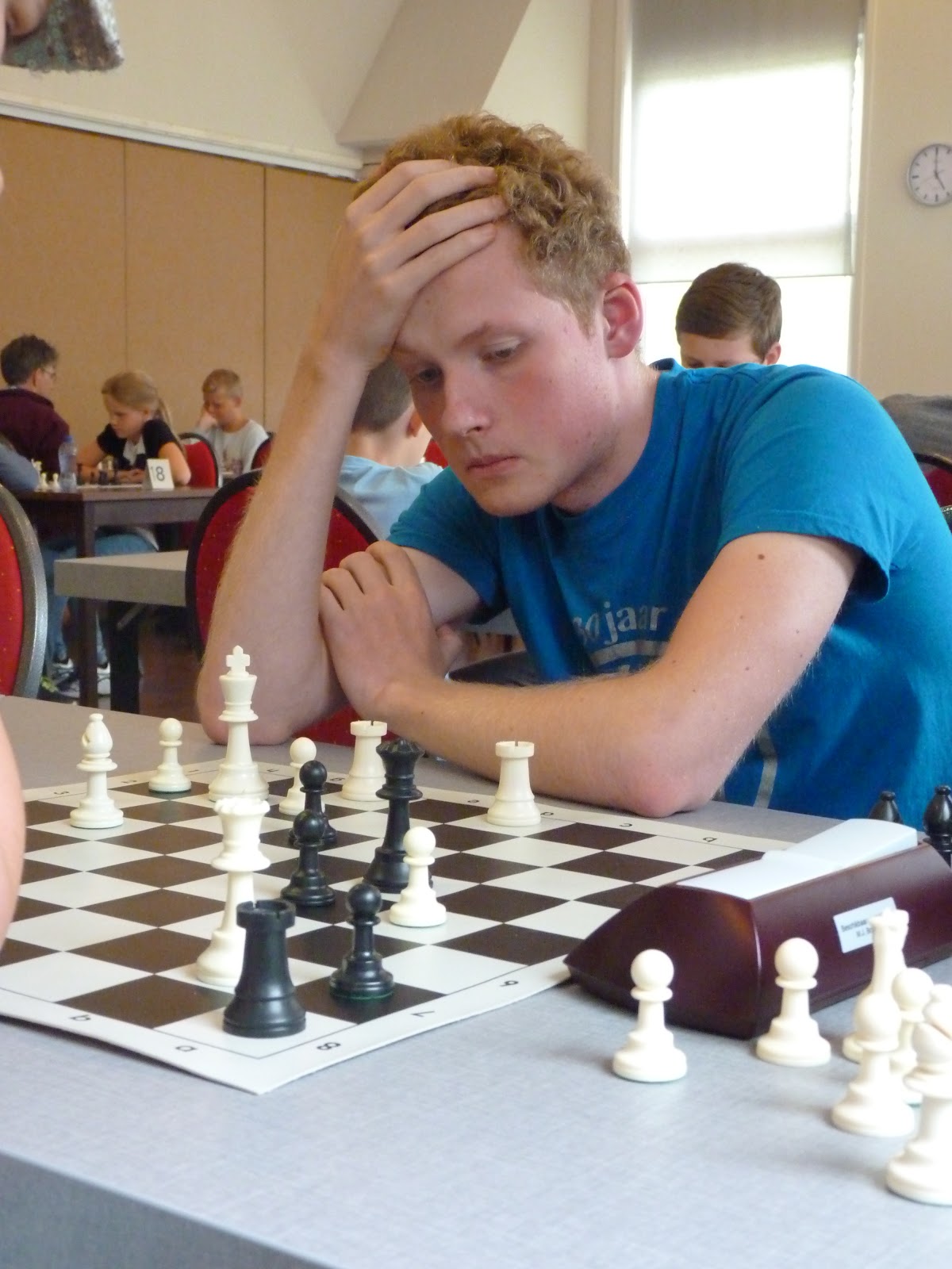 Gerbrich staat ondertussen iets minder. Janko heeft ook wat moeite om zijn stukken goed mee te laten spelen. Bij Jan is het bord ontploft met offers over en weer. Zo te zien komt hij twee stukken tegen toren en twee pionnen te staan. Bij Jonas is de vraag of Pg5 kan. En Christian kan ik helaas niet zo goed volgen.