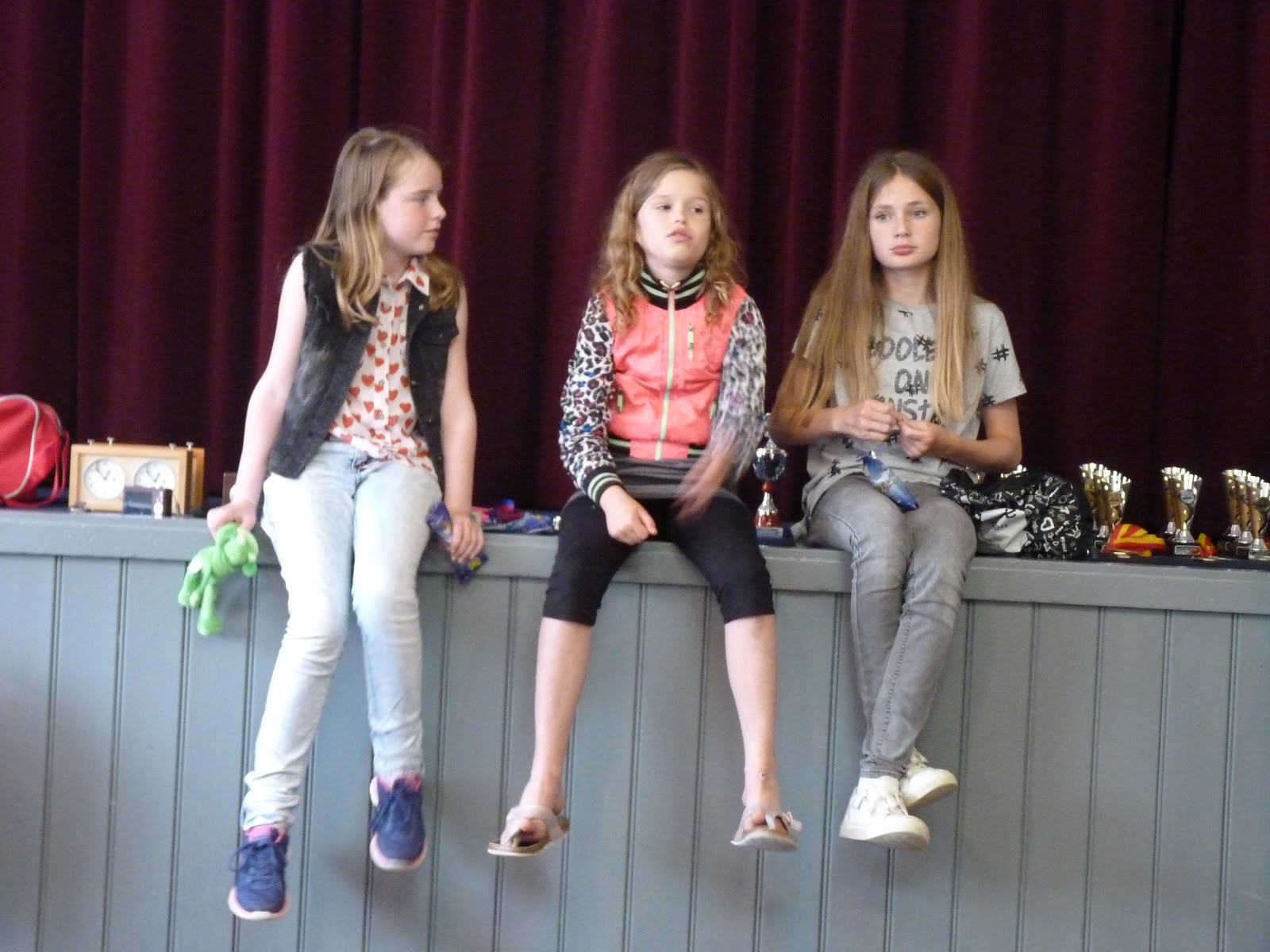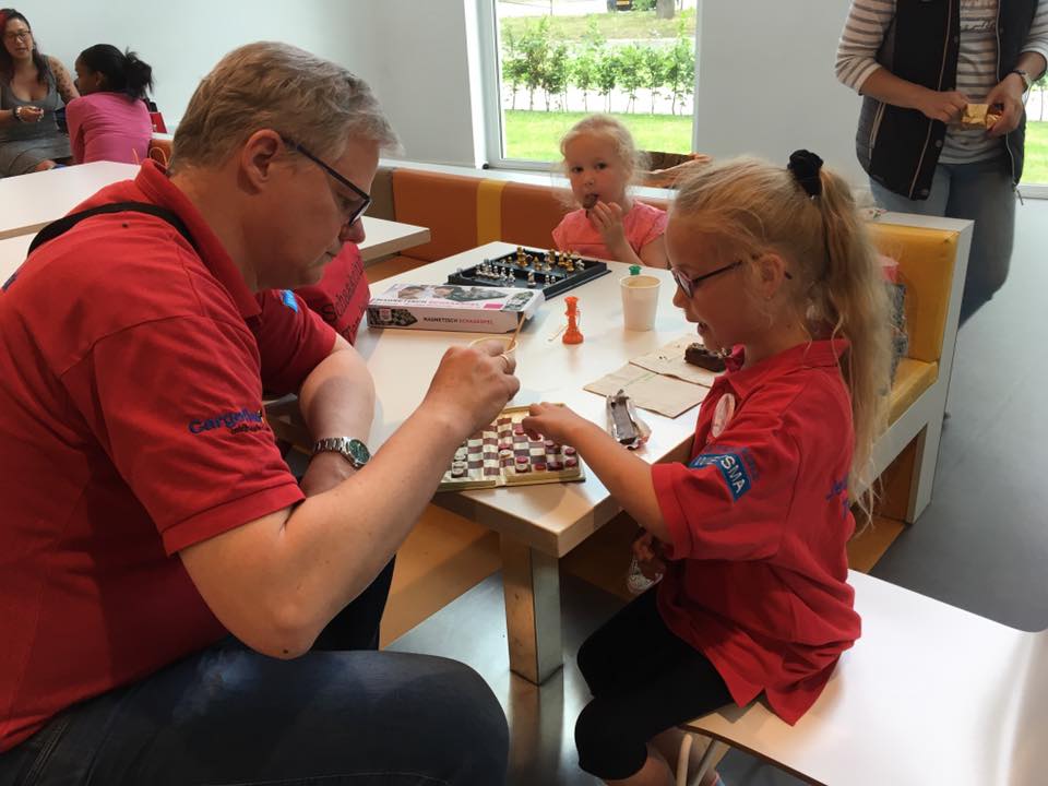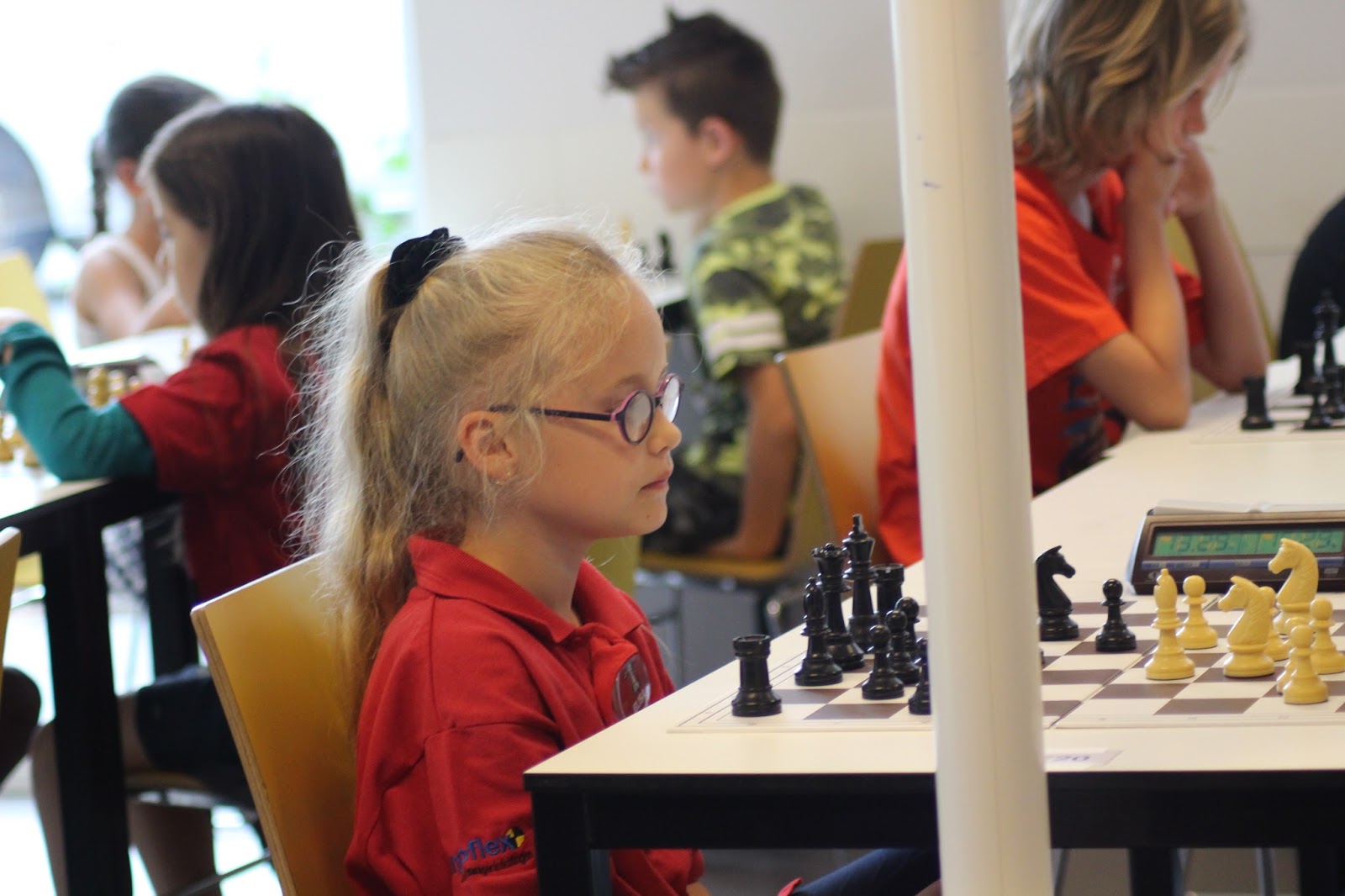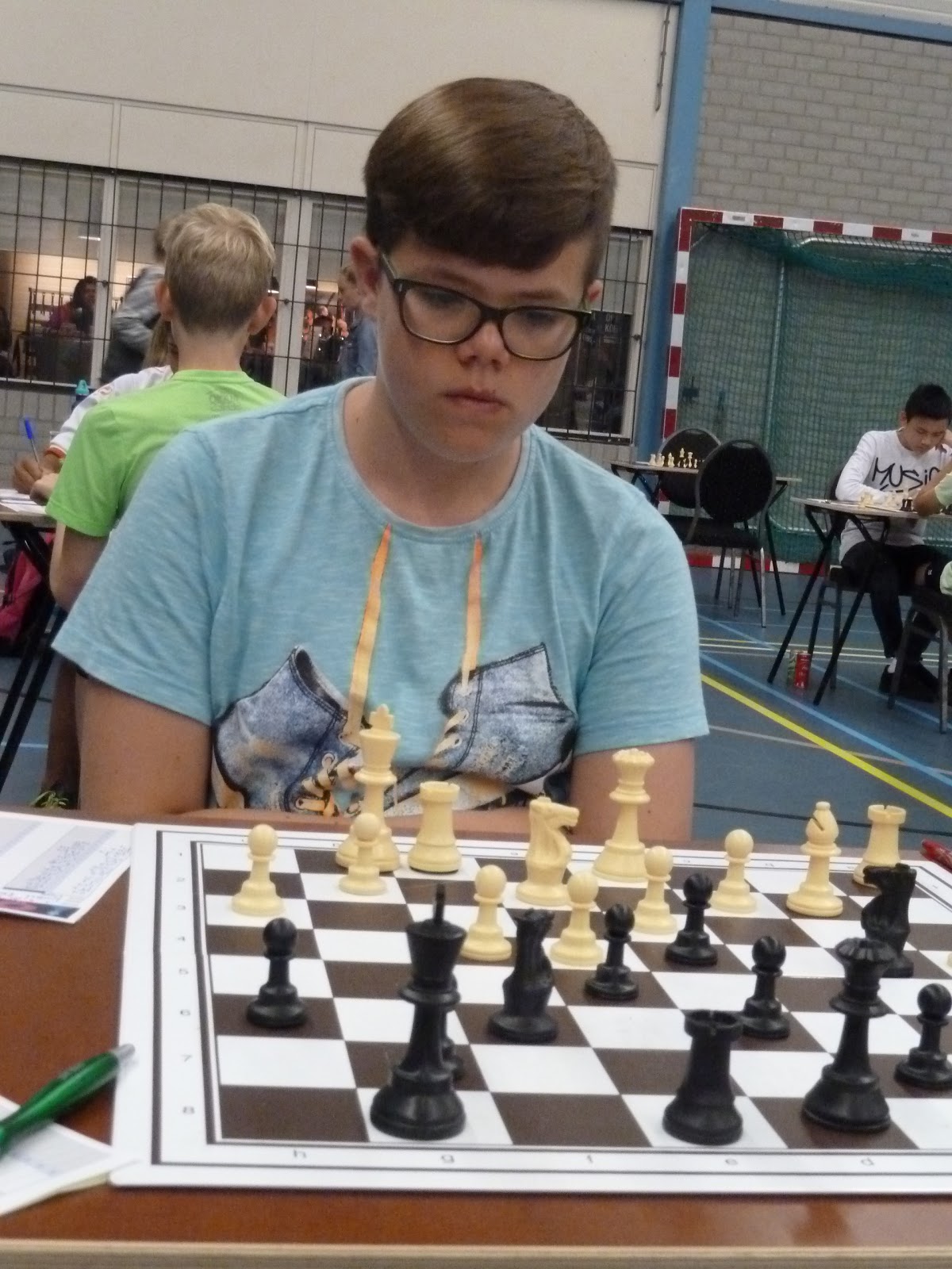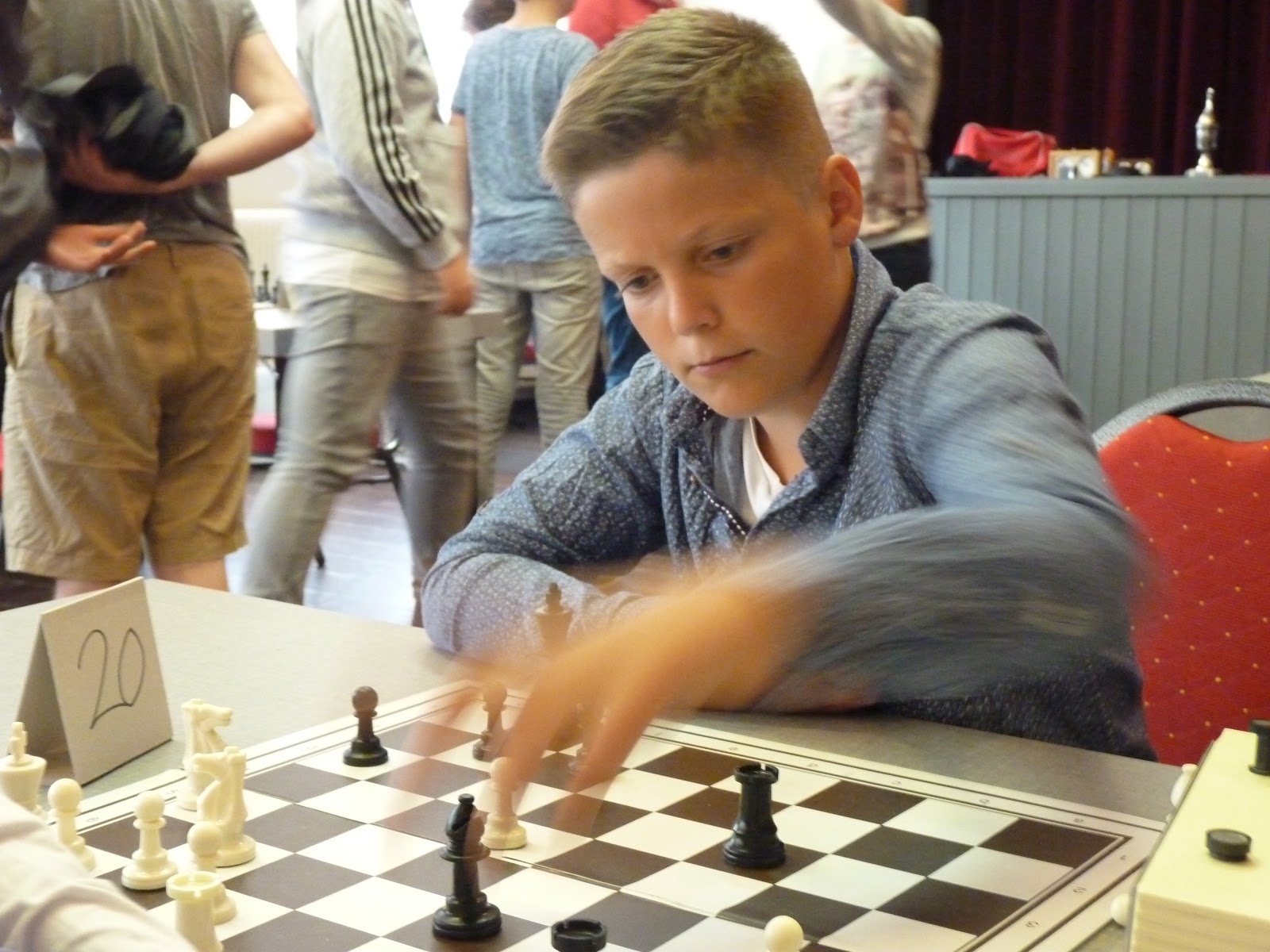 Gerbrich staat ondertussen iets minder. Janko heeft ook wat moeite om zijn stukken goed mee te laten spelen. Bij Jan is het bord ontploft met offers over en weer. Zo te zien komt hij twee stukken tegen toren en twee pionnen te staan. Bij Jonas is de vraag of Pg5 kan. En Christian kan ik helaas niet zo goed volgen.