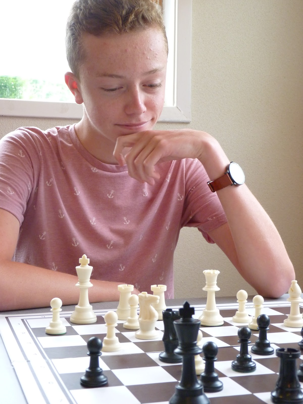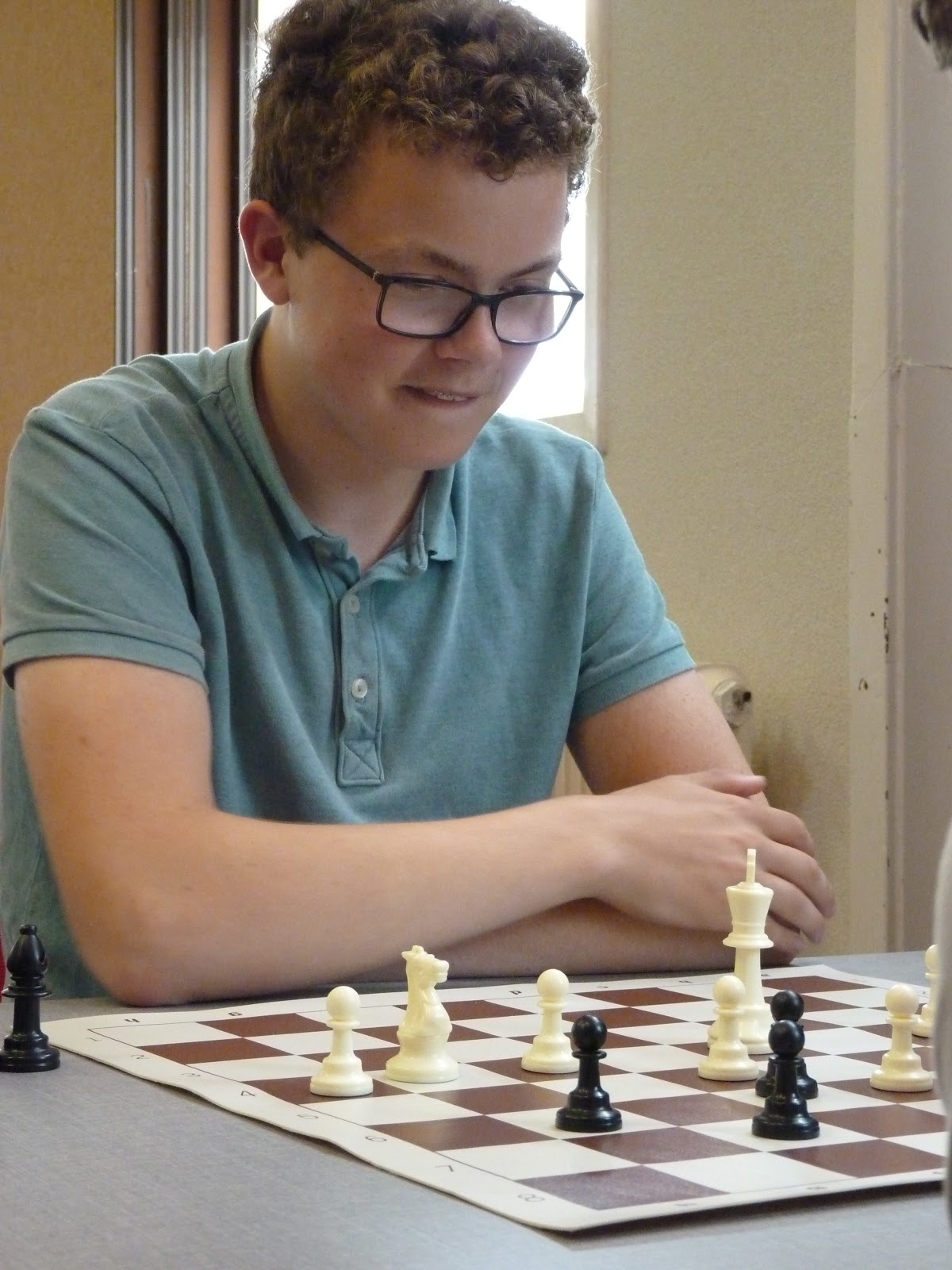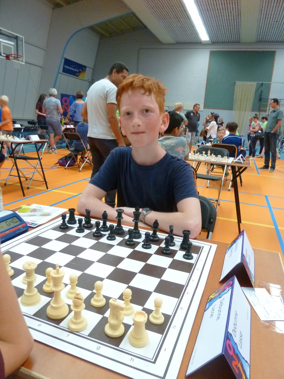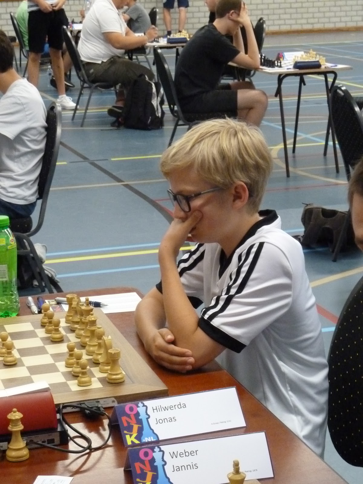 Jonas wint, de tegenstander geeft op in een stelling waar nog veel kan gebeuren, maar waar Jonas toch wel erg goed lijkt te staan.