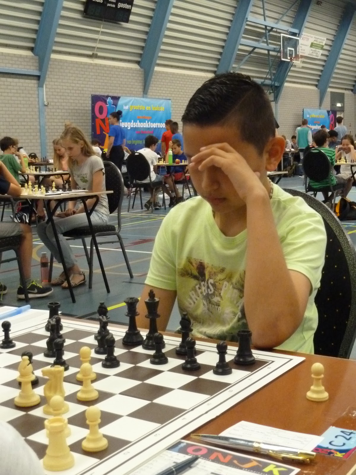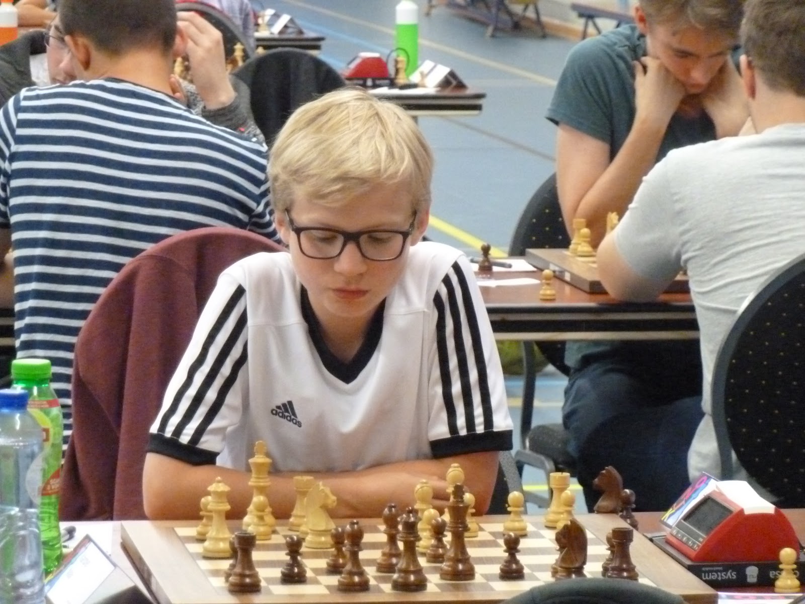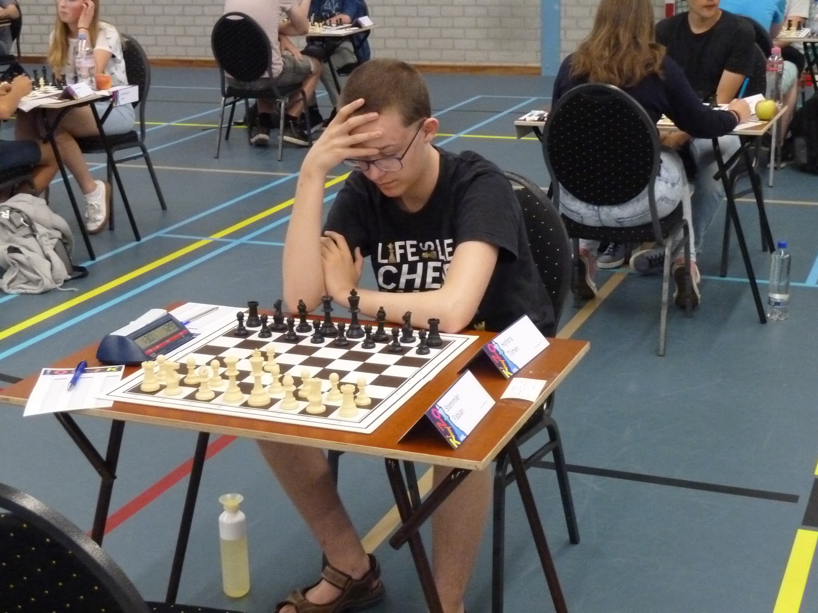 Jonas wint, de tegenstander geeft op in een stelling waar nog veel kan gebeuren, maar waar Jonas toch wel erg goed lijkt te staan.