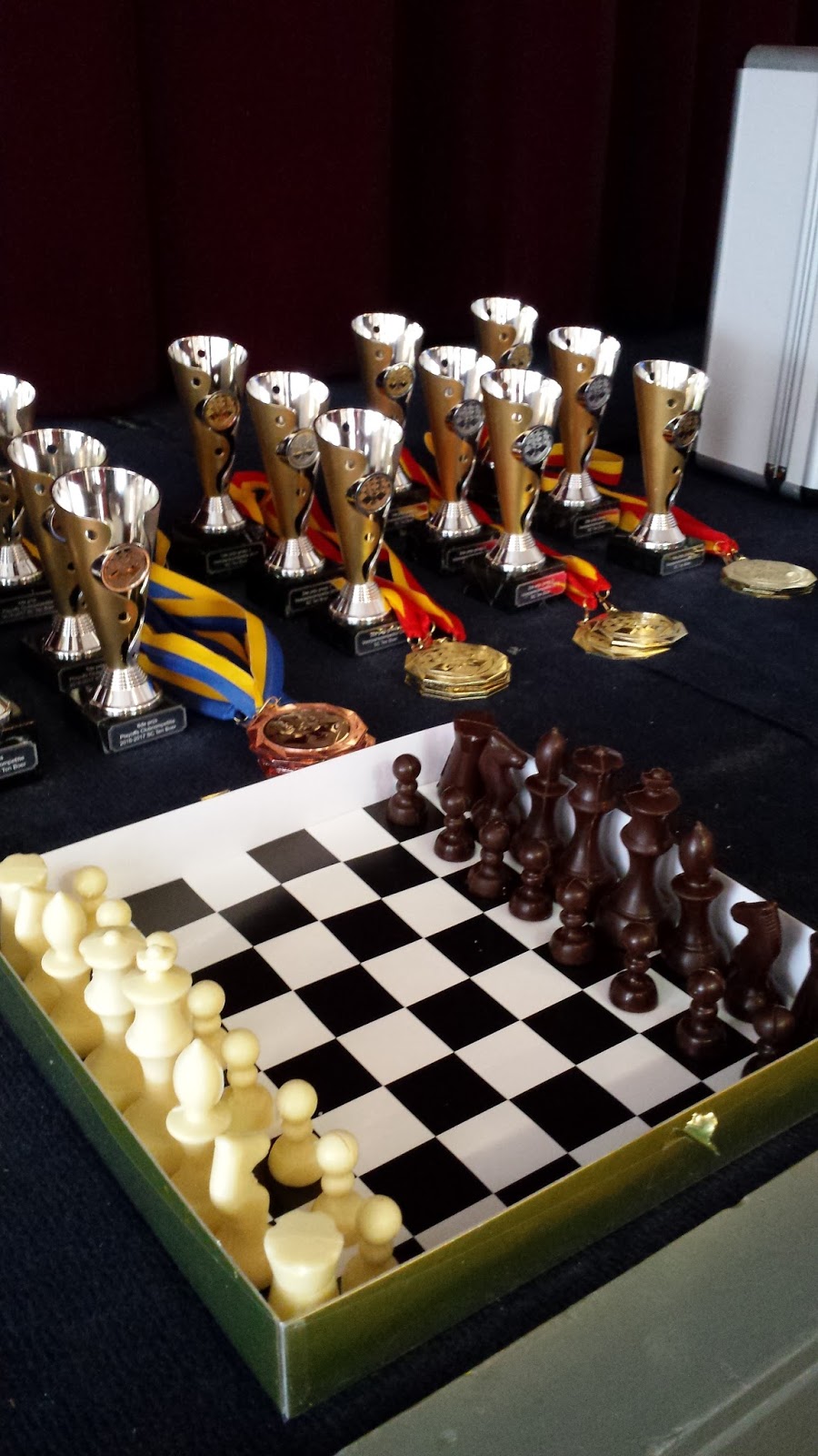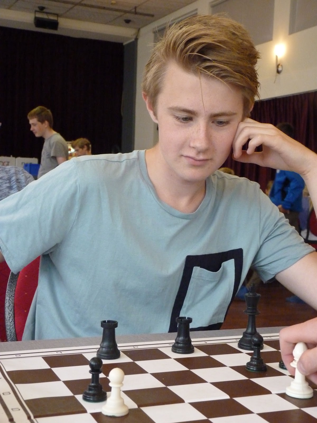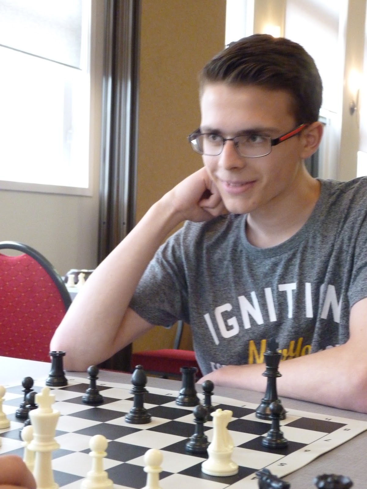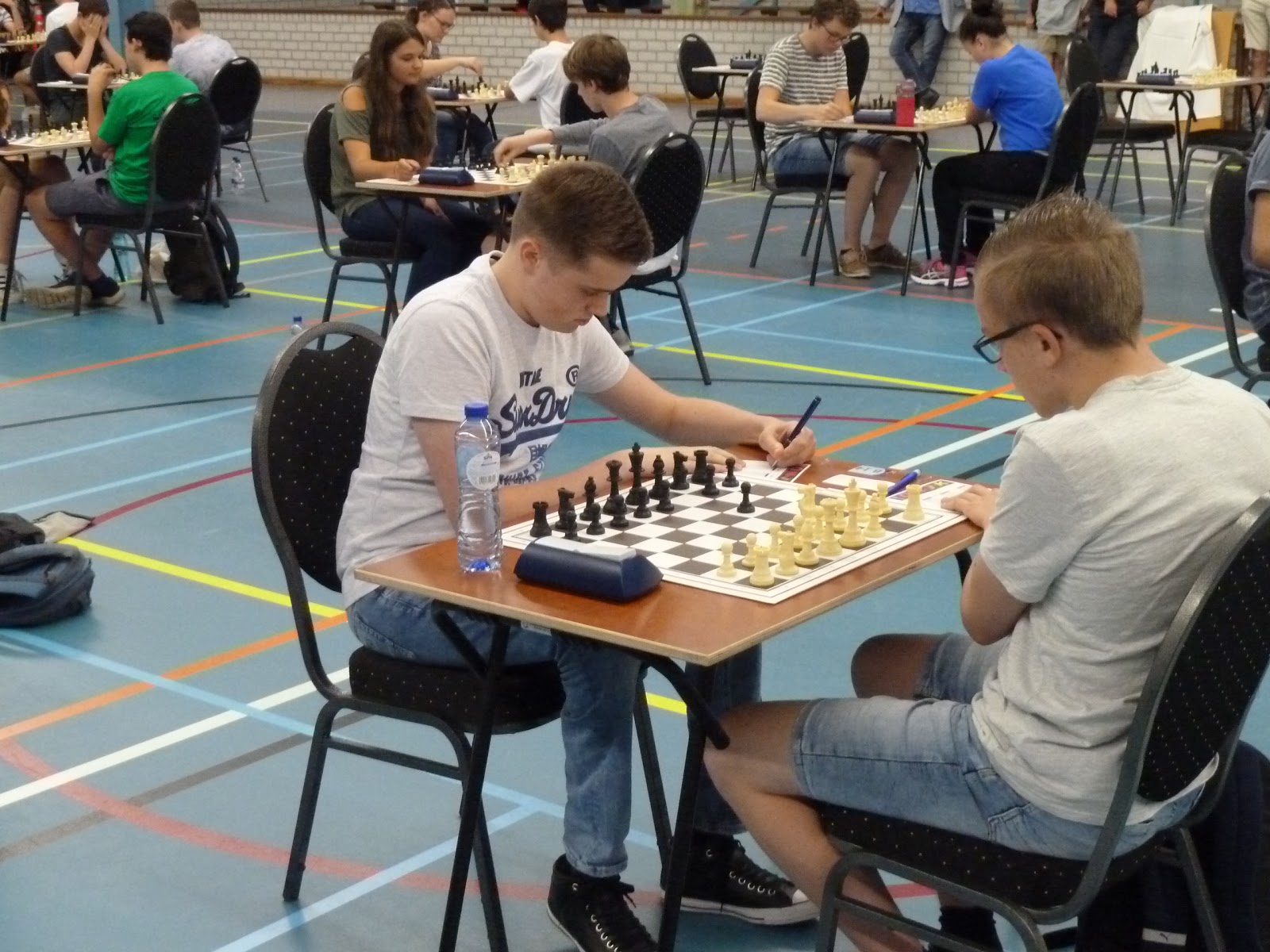 Jonas wint, de tegenstander geeft op in een stelling waar nog veel kan gebeuren, maar waar Jonas toch wel erg goed lijkt te staan.