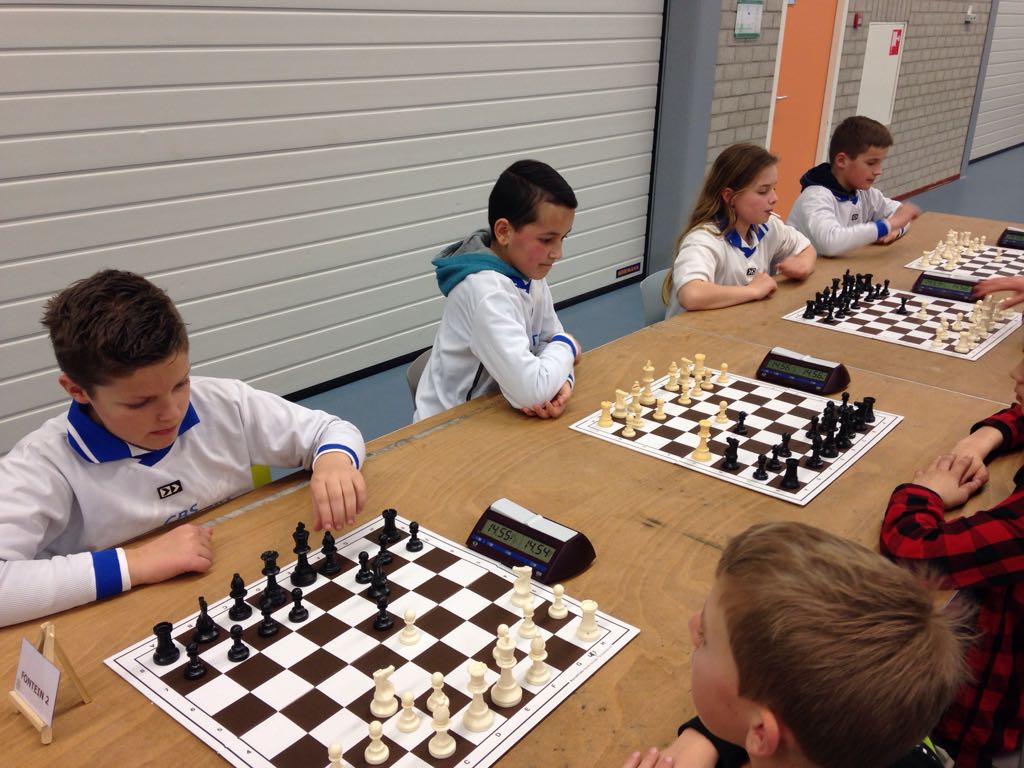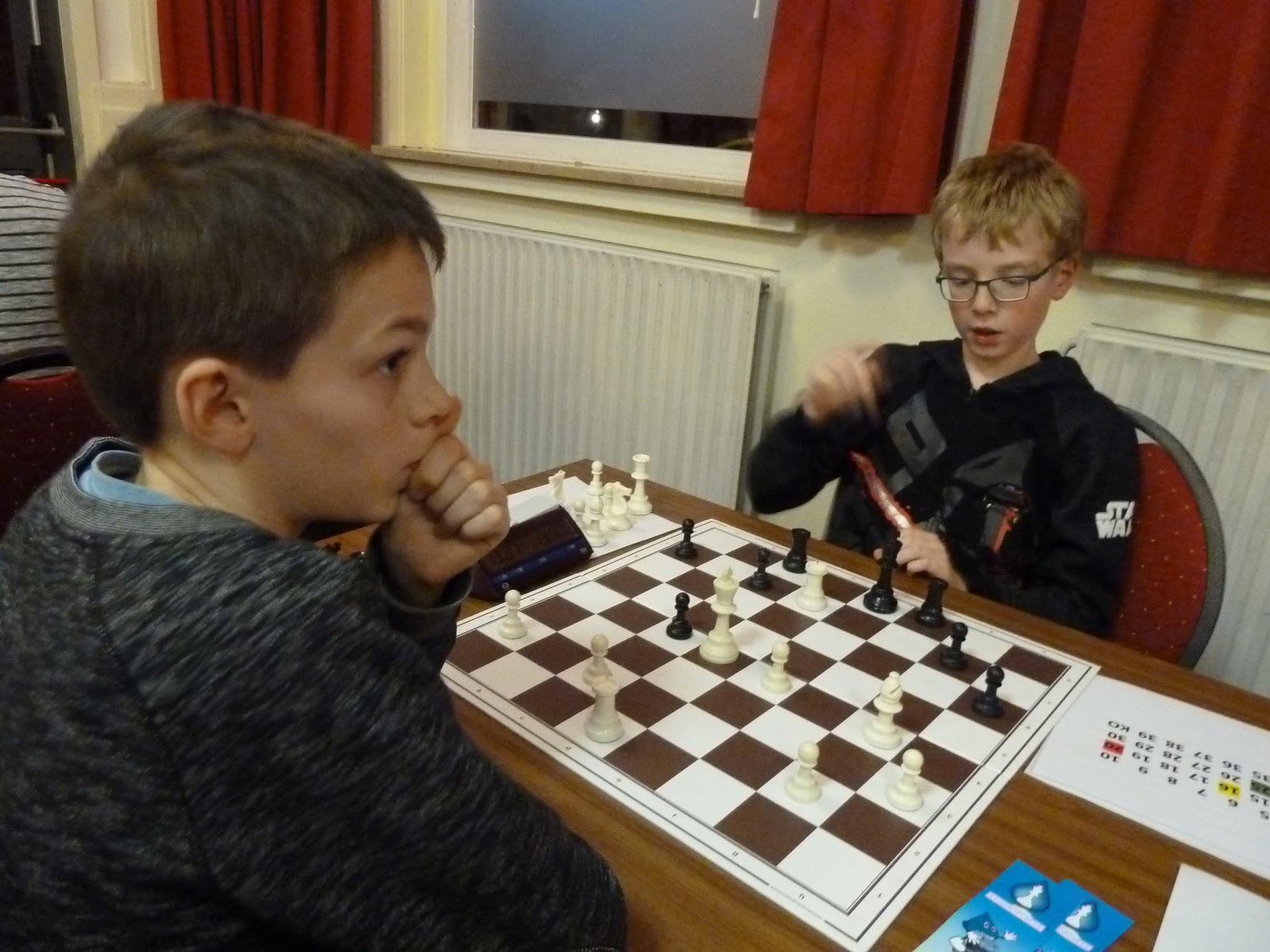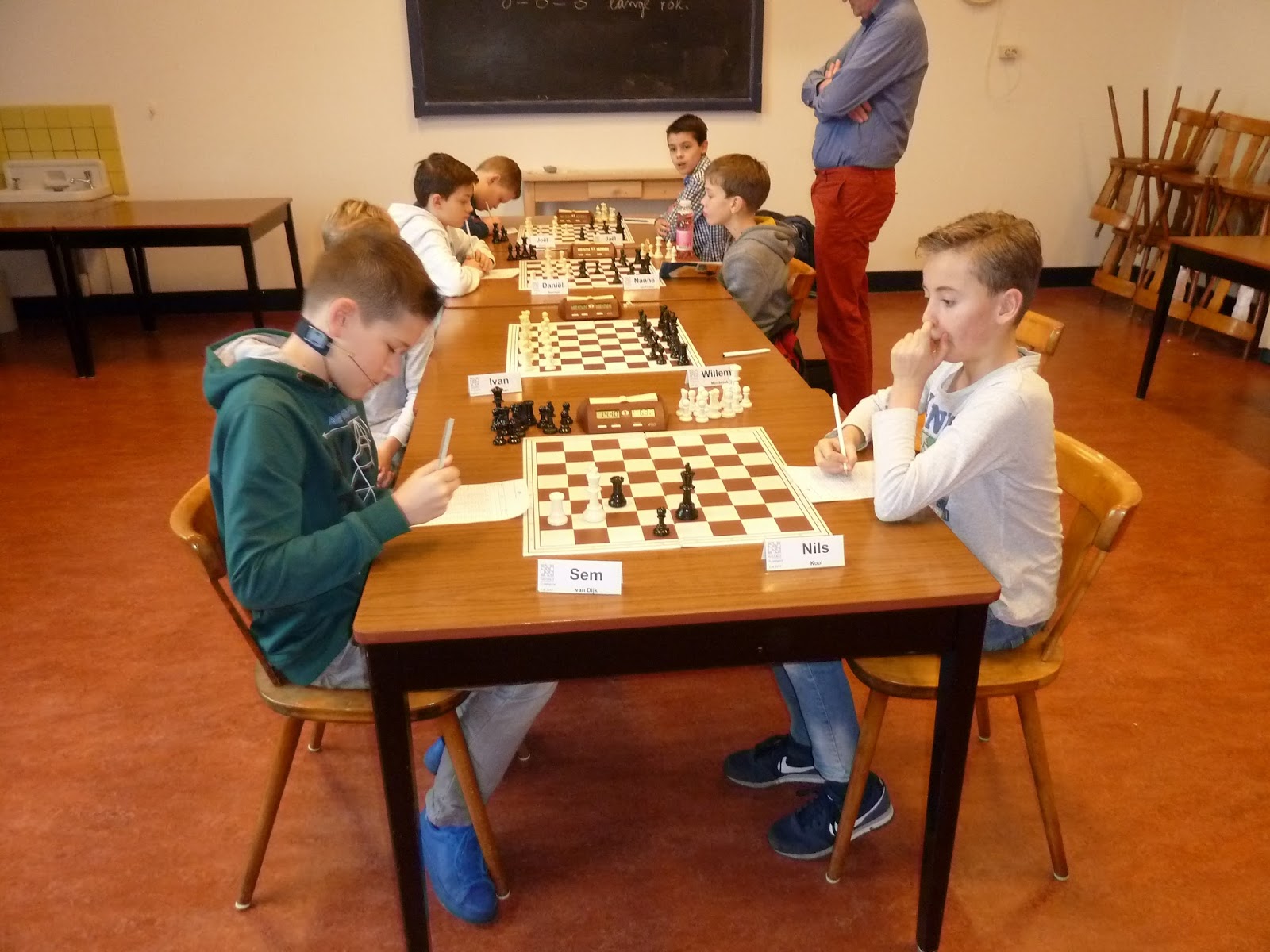Ons eerste team leverde een goede prestatie. Van de vier wedstrijden wisten ze er twee te winnen. Joël en Daniël speelden heel rustig en dat gaf het goede voorbeeld voor Jovan en Sem, die ook rustiger probeerden te spelen. Joël wist zelfs bijna te winnen van Tobias, maar zette in gewonnen stelling pat.