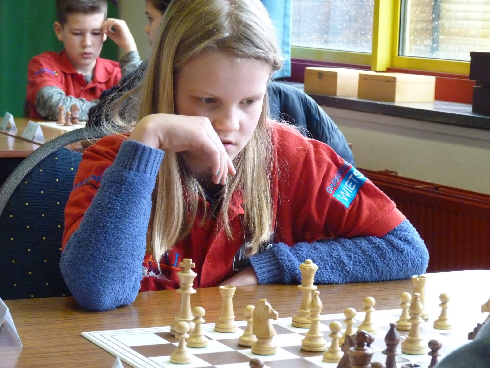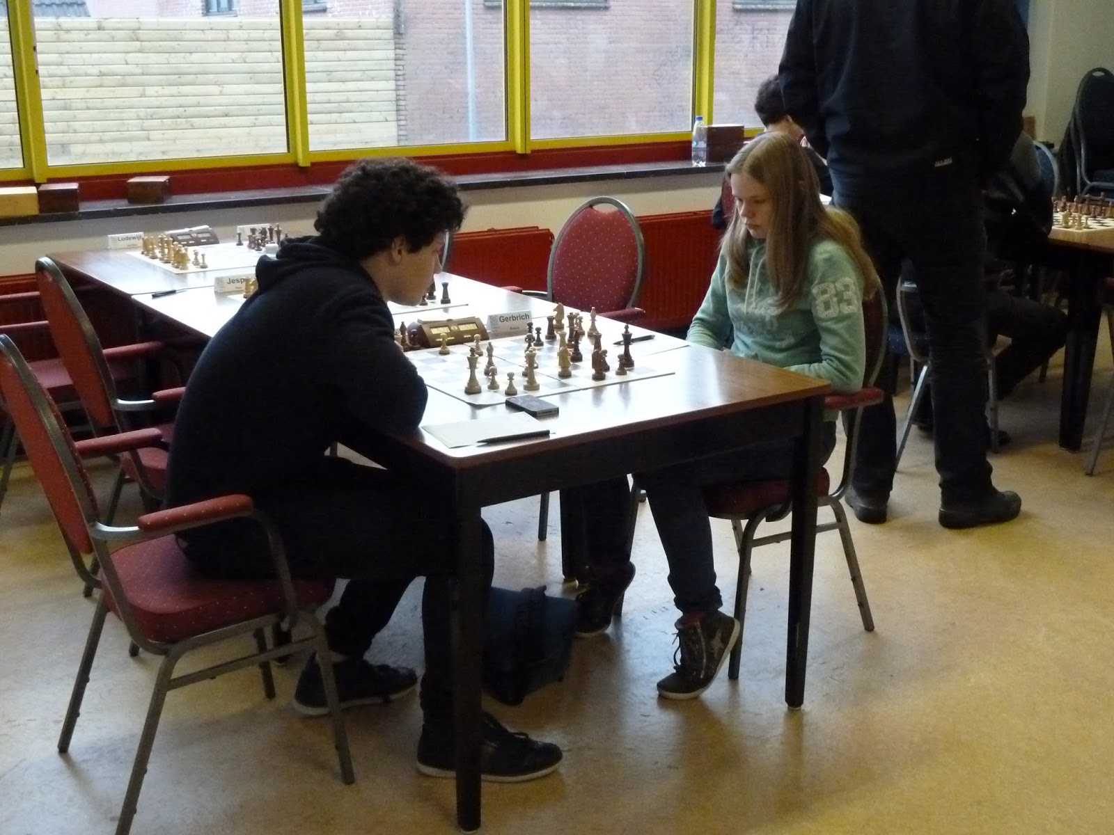 Tetske mist echter een vork en vergeet vervolgens eeuwig schaak te geven. Alsnog wint Gerbrich. Sneu voor Tetske die meer verdiend had. In de laatste ronde van de dag wint Gerbrich wel eenvoudig van Jarno.
