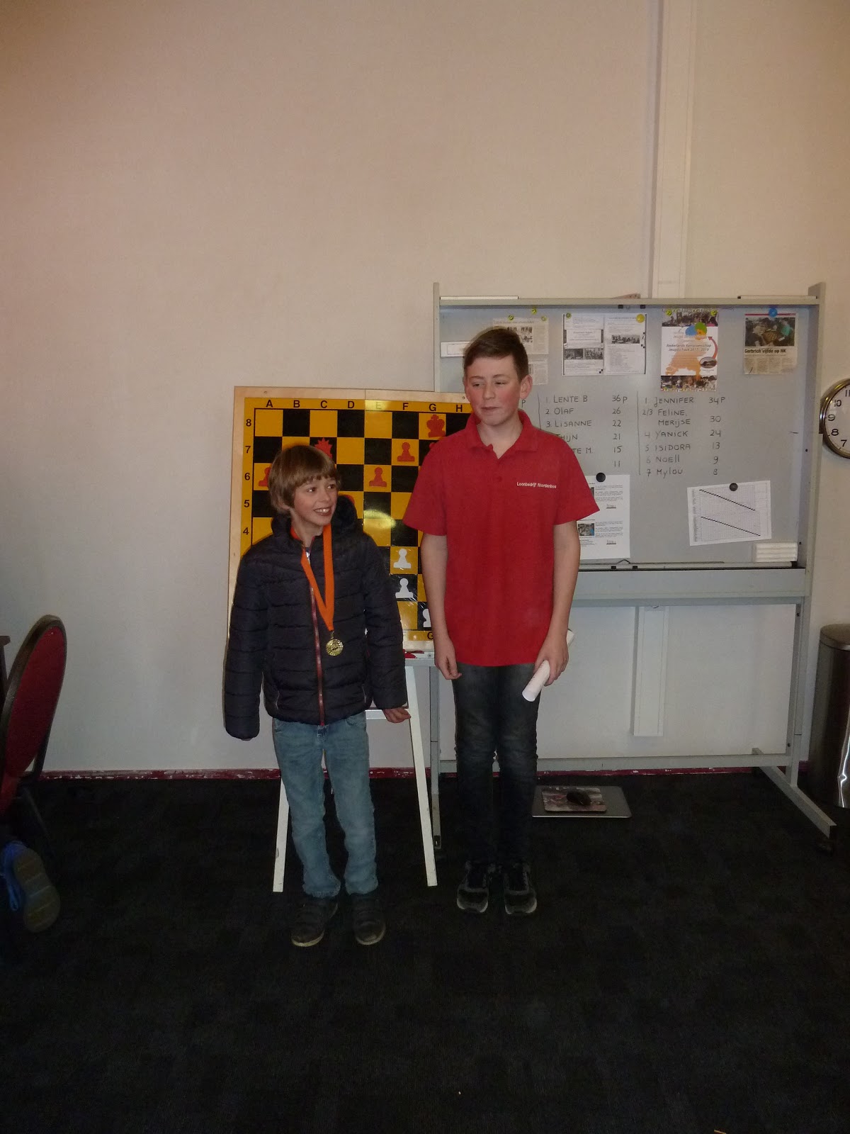 Jarno was de verrassing van het toernooi. Met 3 uit 7 deed hij het geweldig. In de eerste twee ronden van vandaag won hij van Tetske en Remmelt. En ook in de laatste ronde tegen Luca stond hij een tijdje iets beter. Met 3 uit 7 eindigde hij net onder Gerbrich op de negende plaats.