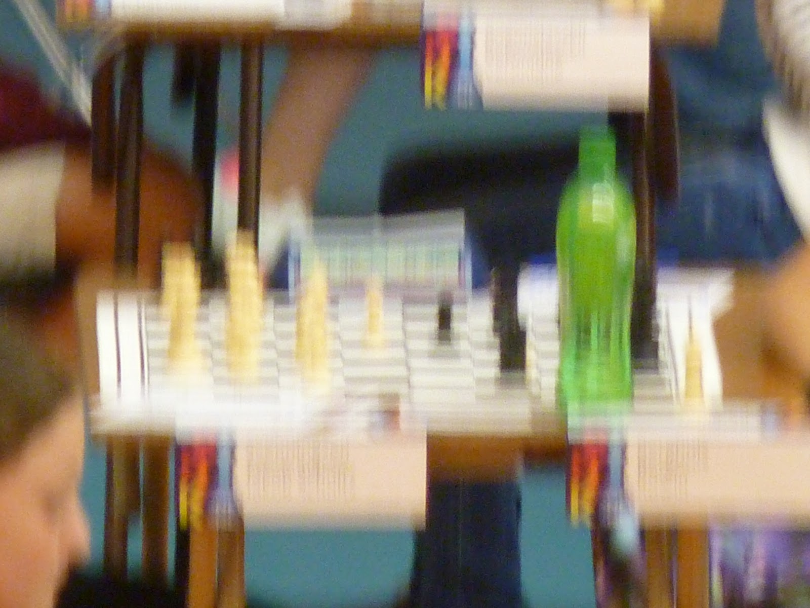 Rowin speelde als enige in de D-groep. Dat maakte dat er minder aandacht voor hem was. Ten eerste omdat de overige 8 schakers in de andere zaal speelden. Ten tweede omdat we niet bij zijn bord mochten kijken. Dirkjan en ik probeerden een indruk van de partij te krijgen door vanaf ongeveer 50 meter afstand met de camera van Dirkjan in te zoomen en een foto te maken. Die foto konden we dan in de display zien en vervolgens vergroten. Snel telden we stukken die naast het bord stonden om een idee te krijgen of Rowin voor of achter stond. Dat gaf wel eens problemen. Zo had je geïnteresseerde medeschakertjes die er voor gingen staan. Of één van de twee zette zijn flesje met water precies in beeld. Vaak ging het mis omdat we bij het nemen van de foto geen vaste hand hadden.