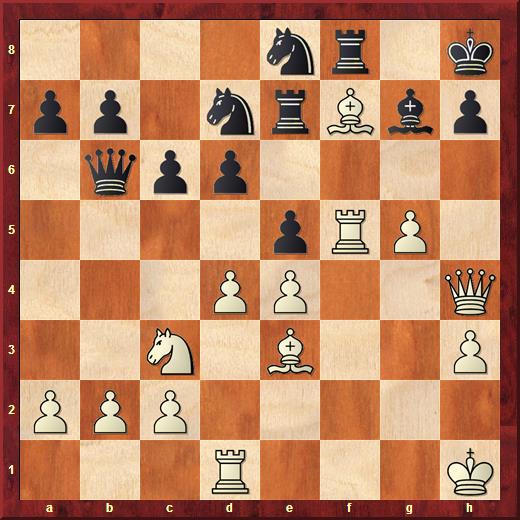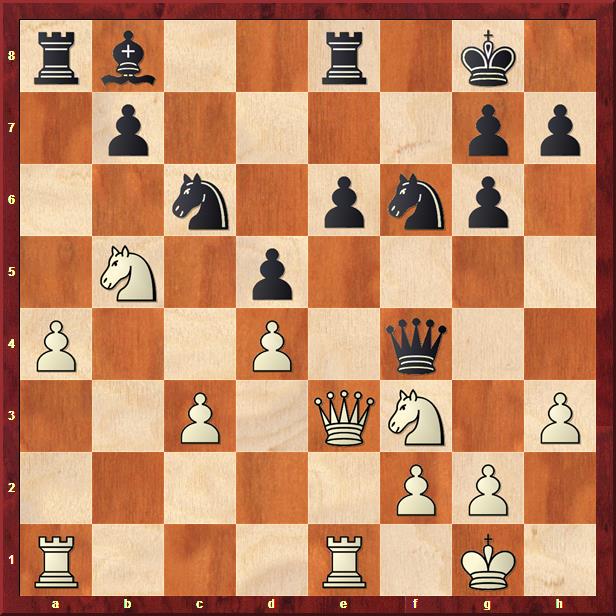In deze stelling speelt Job 1. Ph4, waarna Abedin kiest voor een kwaliteitsoffer met 1… Pxe4 2. Pg6 Pf6 3. Pxf8 Dxf8. Helaas mist hij 3… d5 wat duidelijk maakt dat het paard op f8 nog wel even kan blijven staan voordat het van het bord verdwijnt, terwijl de loper op c4 wel meteen veroverd kan worden.