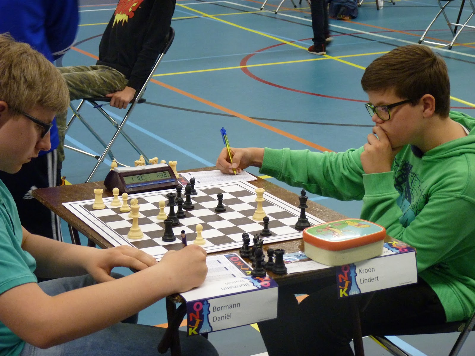 Tycho had een Spaanse opening tegen Pascalle Monteny. Het lukte Pascalle om Lg4 te spelen, iets wat veel liefhebbers van het Spaans willen voorkomen. Tycho drukt echter alsnog zijn pionnen op de koningsvleugel naar voren en opent vervolgens de h-lijn om met toren en dame mat te zetten (1-1).