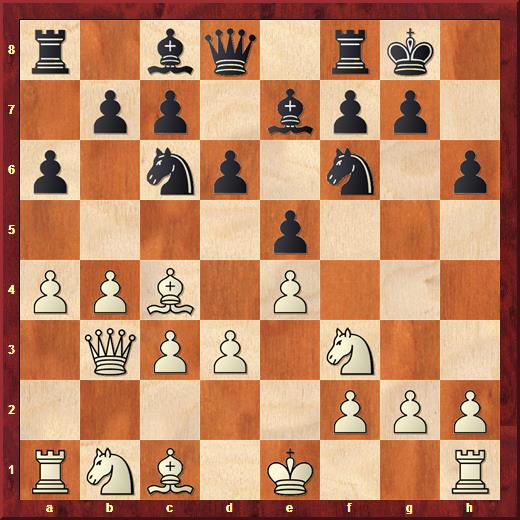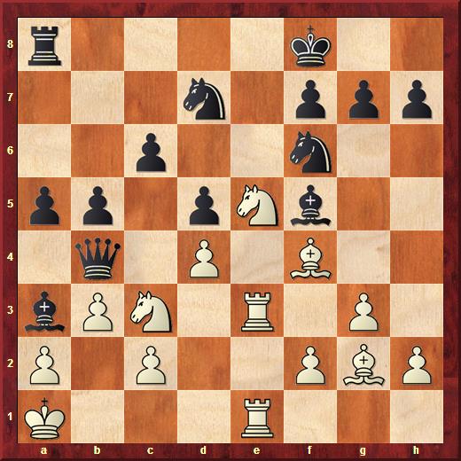 Deze stelling is tekenend voor de complexe strijd die ontbrandt tussen Abedin en Job. Er dreigt 1… d4 en om dit te voorkomen moet wit eigenlijk 1. Pe4 (ondermijnt het paard dat helpt bij d6-d5) spelen. In plaats hiervan speelt Job 1. Db2 om na 1… d5 te ontdekken dat na 2. La2 d4 met problemen voor de loper op e3 en de pion op b4 volgen. Hij kiest voor 2. Lxa6 Lxa6 3. b5 waarna Abedin tot mijn verrassing de juiste voortzetting vindt, waarvan ik niet weet wat het gevolg is: 3… d4 4. cxd4 en nu misschien wel niet het gespeelde 4… Pxd4 5. Lxd4 exd4 6. bxa6 maar 4… exd4 5. Lf4 Pb4 is nodig met complete chaos. Er dreigt 6… Pxd3 met winst van de loper op f4, dus 6. Lxc7 is nodig. Ik weet niet hoe het staat. De stelling is erg moeilijk te beoordelen.