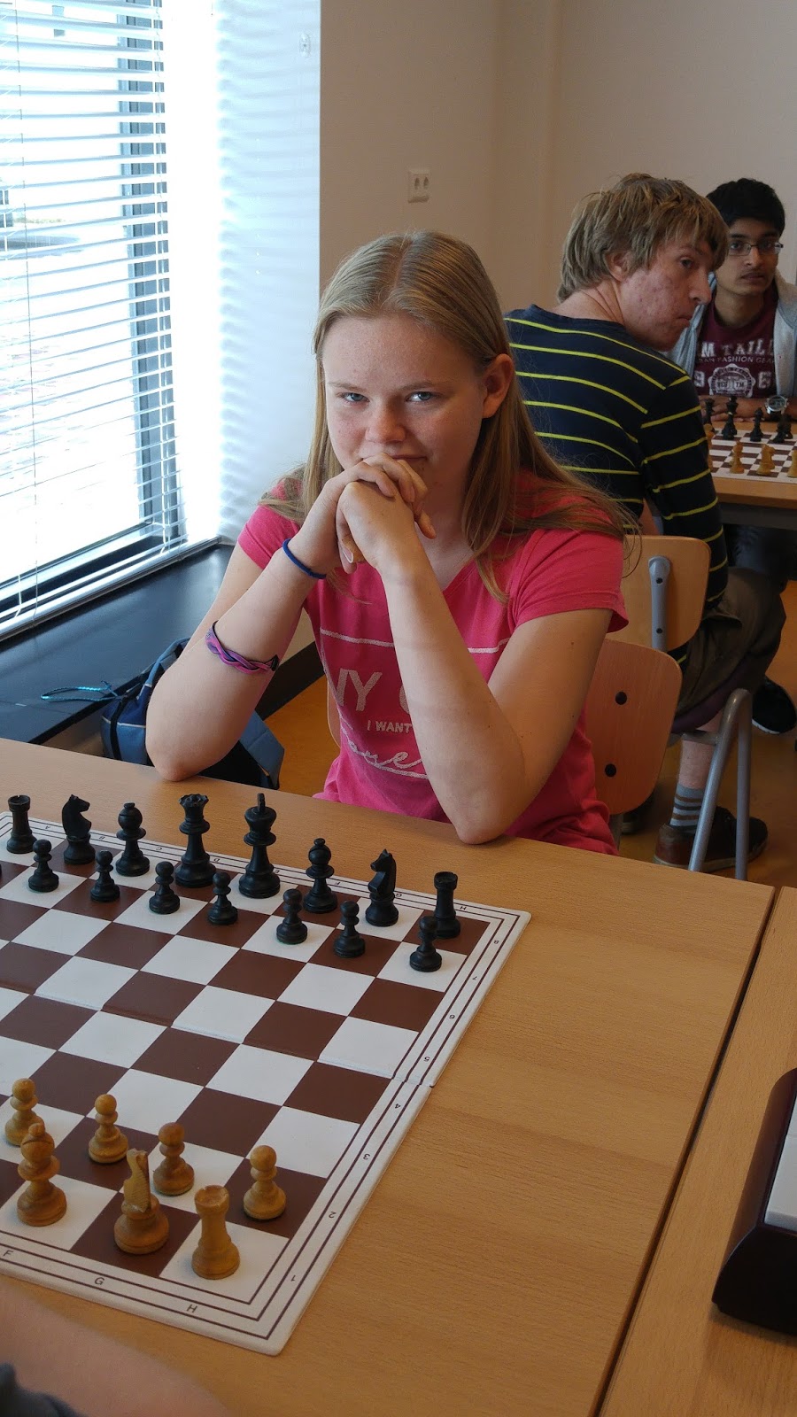 Ons team kwam eigenlijk wel goed te staan. Janneke had het moeilijk en zou verliezen, maar Stella en Yrsa stonden beter. Bij Lyne kon het alle kanten opgaan. Helaas miste Lyne en taaie verdediging en verloor Stella door een dubbele aanval haar stuk. Alleen Yrsa kon met een knappe partij haar tegenstander verslaan.