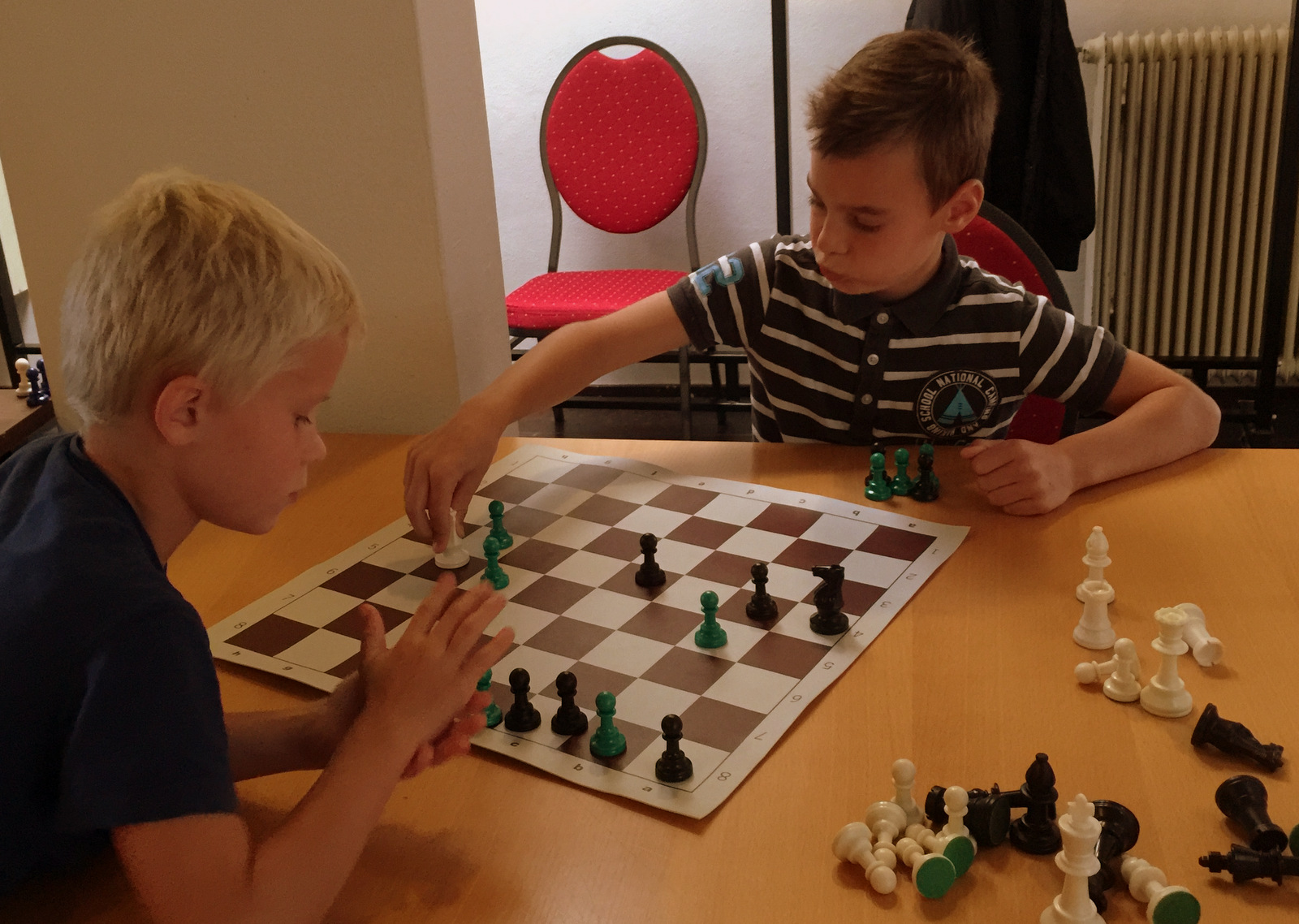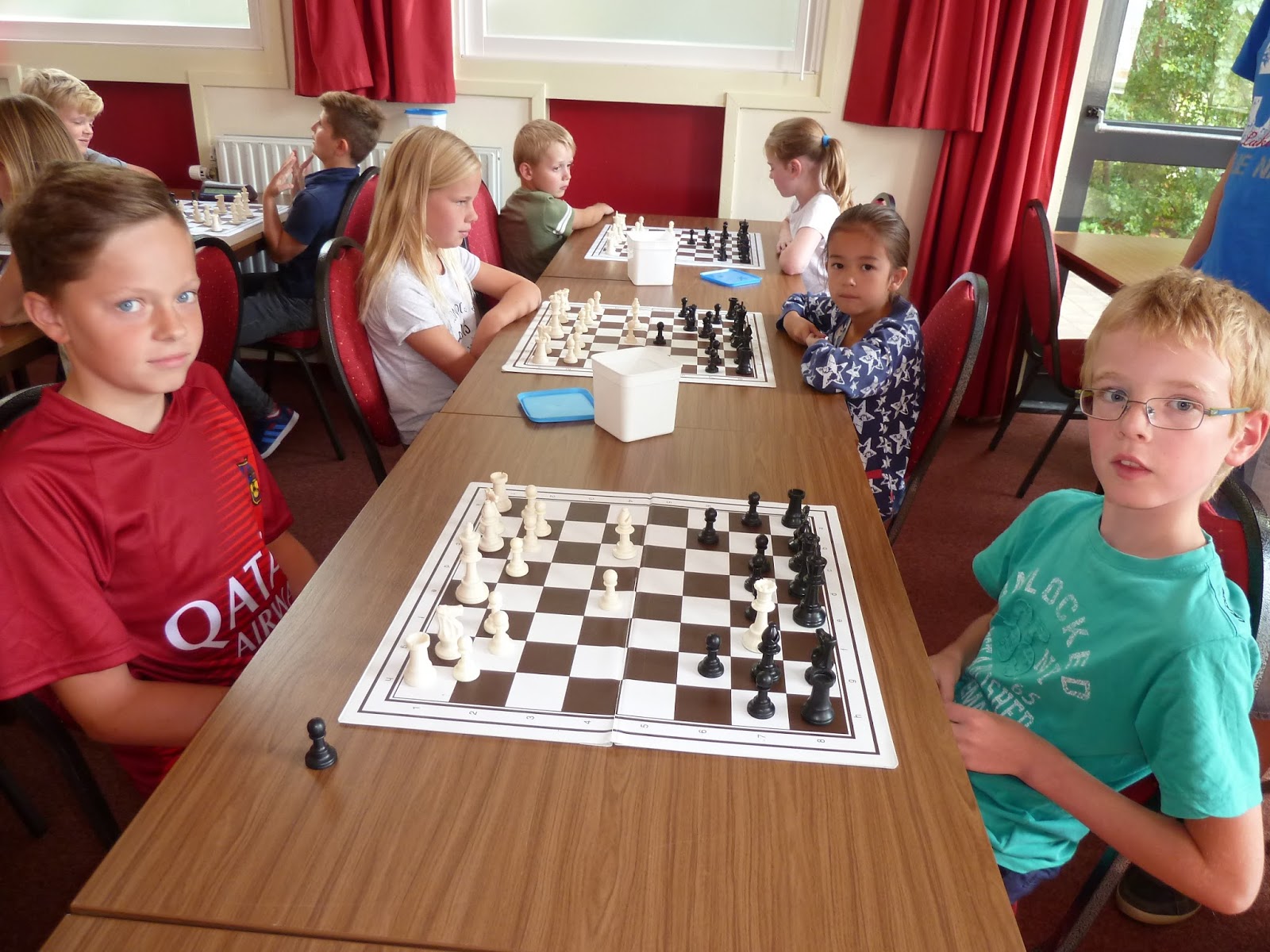 Vrijdag zijn we weer begonnen met het jeugdschaak in Ten Boer. Voor het eerst in de historie met meer schakers op de middelbare school dan op de basisschool. We zijn er als jeugdleiding heel blij mee. Niet iedereen was overigens aanwezig. Er waren nog veel op eerstejaarskamp of zelfs in Praag met school. Als iedereen er is dan zitten we op een groep van 27 op de middelbare school en een groep van 15 op de basisschool.