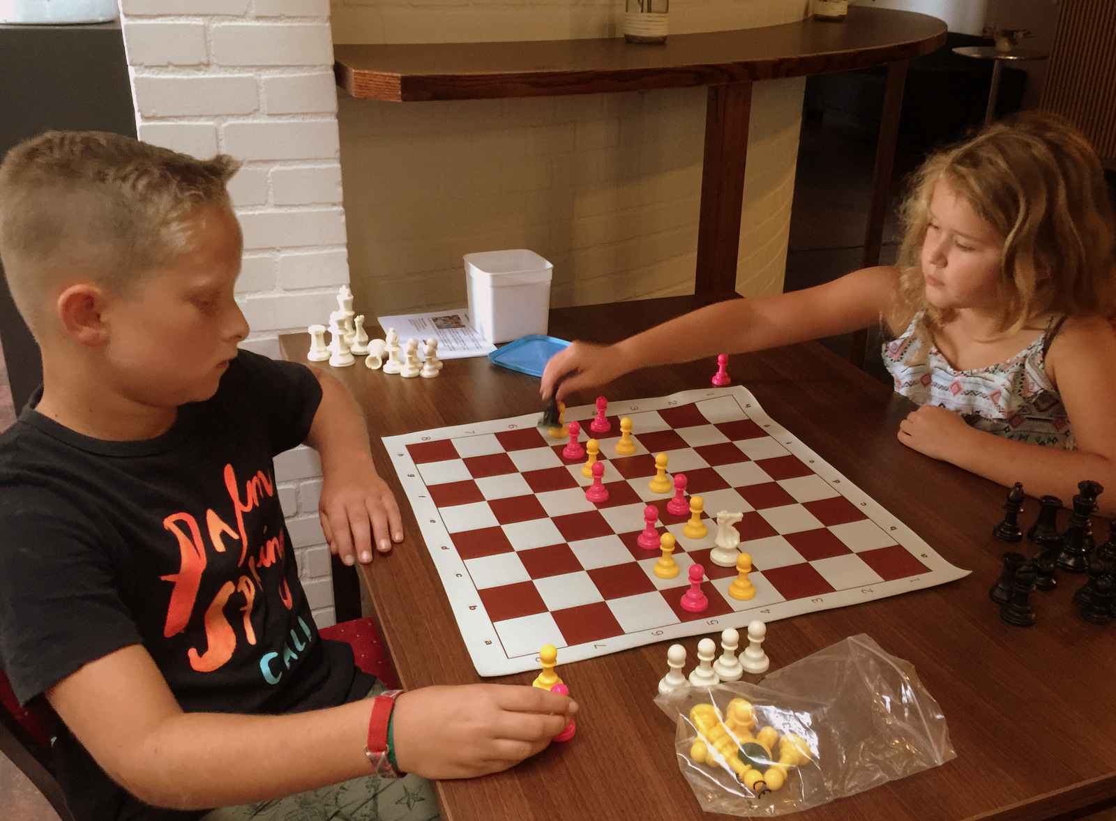 In de derde groep de schakers die nog maar net of zelfs helemaal nog niet kunnen schaken. Zij deden maar liefst vier schaakgerelateerde opdrachten, waarna ze aan het eind echt een partij tegen elkaar kunnen schaken.