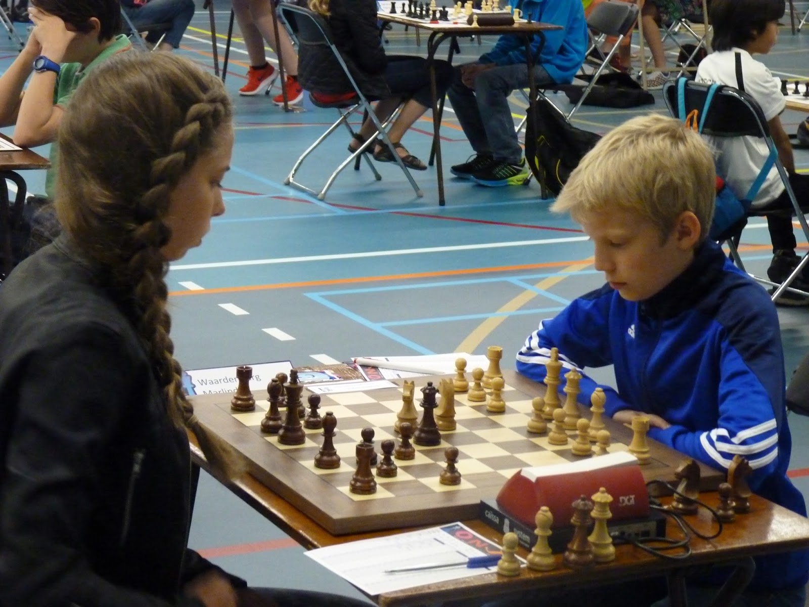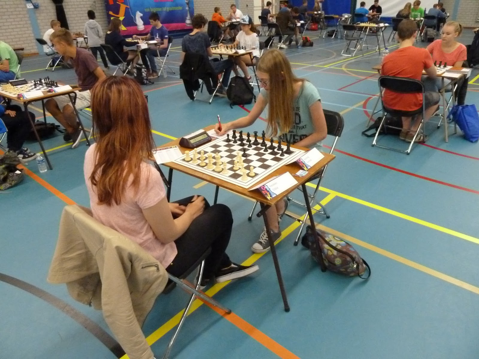 5 En dan natuurlijk de enige echte reden voor de tijd die zit tussen de opening en het daadwerkelijk starten van de partijen: Omdat nu bekend is wie er precies meedoet en is komen opdagen moet in deze tijd de indeling worden gemaakt van 150 partijen, op elke tafel moeten de juiste naamkaartjes staan, de klokken moeten goed staan net als de stukken en overal moeten twee notatiebriefjes liggen. Dat klinkt best veel en dat is het ook, als je bedenkt dat er voortdurend wordt geschaakt bij de vele beschikbare borden en dat ook de klokken daarbij worden gebruikt.