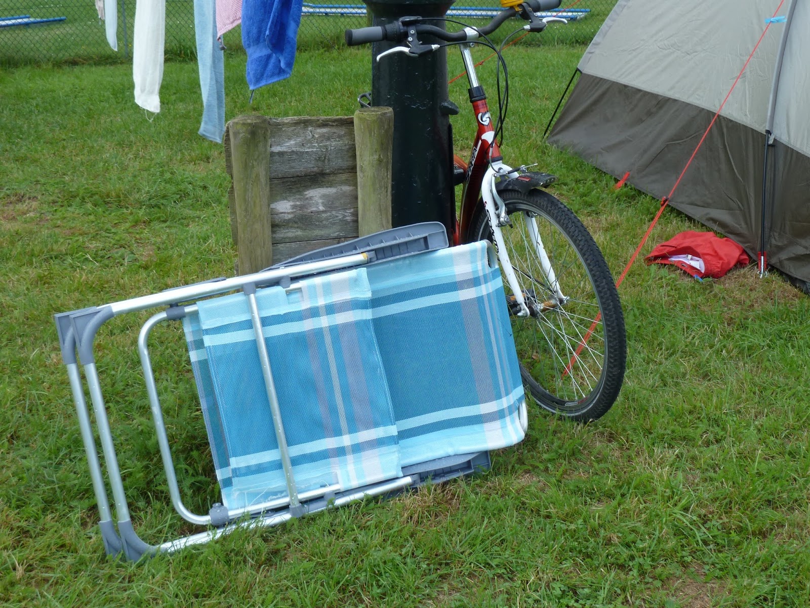 Voor even wel in ieder geval. Helaas bleek een van de stoelen een fabricagefoutje in het stiksel te hebben. Tot dat moment was Daan de gelukkige die op de stoel zat. Hij was echter ook de ongelukkige die erdoor zakte. Reparatiepogingen van vader Rindert, die van alles uit zijn fietstas toverde, mochten niet baten. Marjolein, altijd praktisch, optimistisch en vindingrijk, verbaasde ons even later. Terwijl ze een stoel te leen vroeg bij de receptie, bleek bij de container een afgedankte klapstoel te staan, waar je nog prima een week op kunt zitten. De stoelenvoorraad is toch weer compleet!