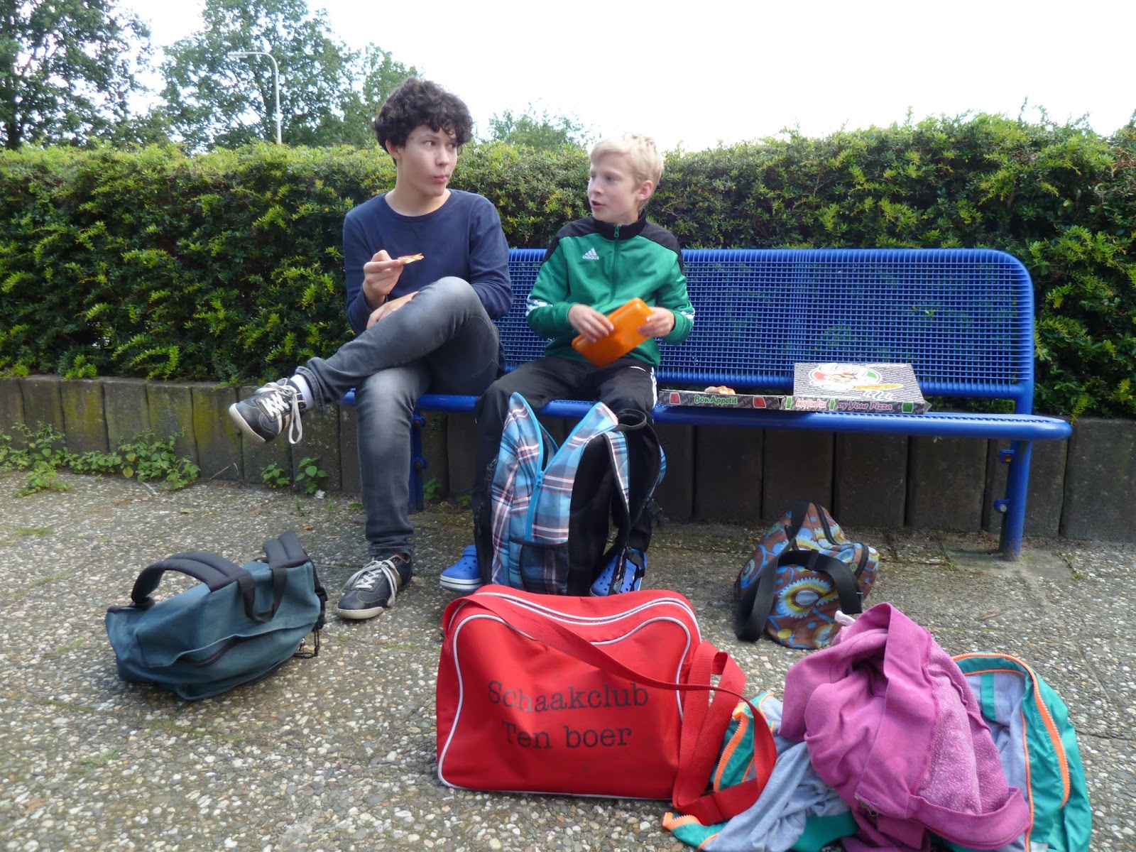 In de sporthal heerste tot de laatste wedstrijd een aangename temperatuur. Gerbrich was de laatste die nog schaakte. Toen haar partij was afgelopen had ze nog een kwartier om een fatsoenlijke maaltijd tot zich te nemen. Er was gelukkig al een pizza besteld en gearriveerd. Toen het gezelschap zich installeerde in het sportcafé om deze tot zich te nemen, werd het op niet mis te verstane wijze duidelijk gemaakt dat in een sporthal gesport wordt en geen pizza’s worden gegeten. Eigenlijk heel logisch, toch? Toch verhitte dit de gemoederen enigszins. Met enige tegenzin toog men naar buiten waar ze zich aan wat zonnestralen en de snel afkoelende pizza warmden.