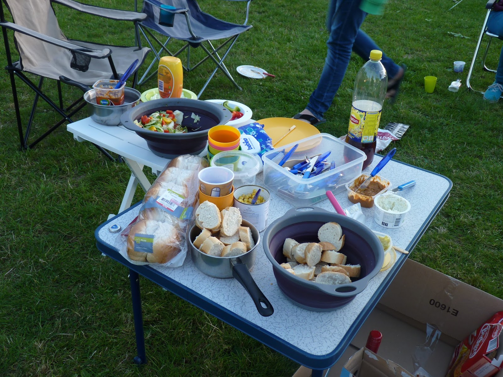 Inmiddels op de camping waren de voorbereidingen voor de barbecue in volle gang. De barbecue was inmiddels aangestoken, er werden nog snel marshmallows gehaald en de patat was besteld. Er was zorgvuldig berekend op welke plek de zon het langs zou schijnen, want we wilden de warmte zo lang mogelijk benutten. Toen kon het feest beginnen! De foto’s vertellen hoe gezellig het was. Toen de barbecues begonnen af te koelen en het vlees niet meer gaarde, pakte Dirkjan zijn kooktoestel erbij en werd ook het laatste vlees nog gaar. Wie koud begon te worden trok meer kleding aan of ging een partijtje voetballen, badmintonnen of bananenswingen.