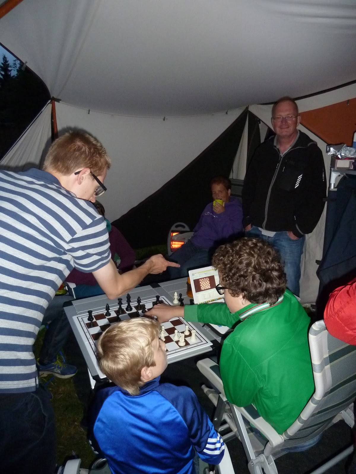 Het schaakgezelschap had zich gisteravond opgesplitst in tweeën. De ene helft zocht de warmte op van de sporthal, door mee te doen aan het snelschaaktoernooi. De andere helft sloeg de handen ineen en organiseerde een gezamenlijke barbecue op de camping.