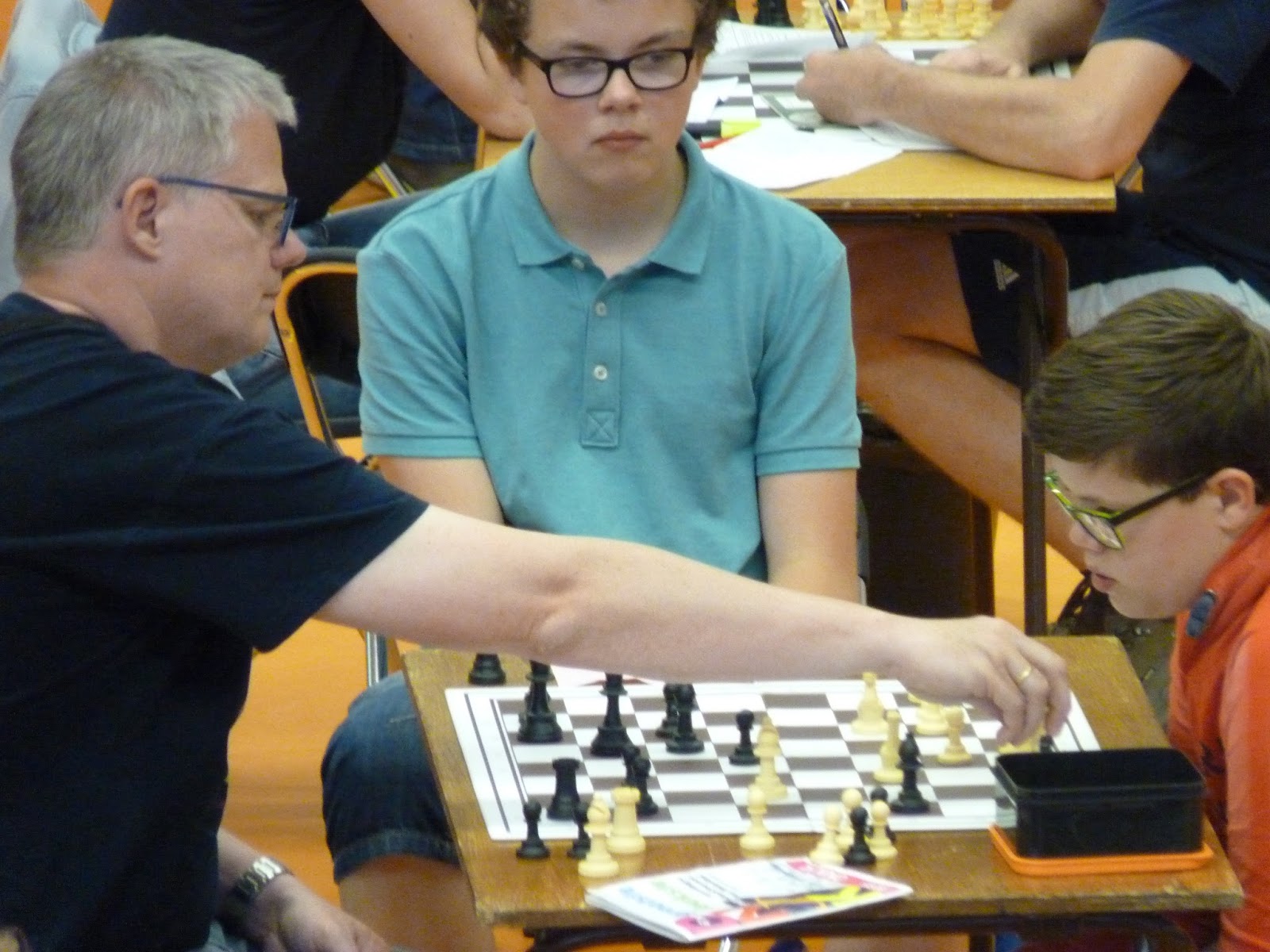 Rowin deed het met 2 uit 3 heel goed. Vooral de laatste partij tegen een Duitse tegenstander was om door een ringetje te halen zo mooi. De tegenstander in een tactisch valletje lokken door vijf voorbereidende zetten: dat mogen we graag zien. Goed gedaan Rowin! Rowin heeft wel pech. Hij is de enige D-speler en we mogen niet bij zijn bord kijken. Dat betekent dat er meer aandacht bij onze A- t/m C-jeugd ligt.