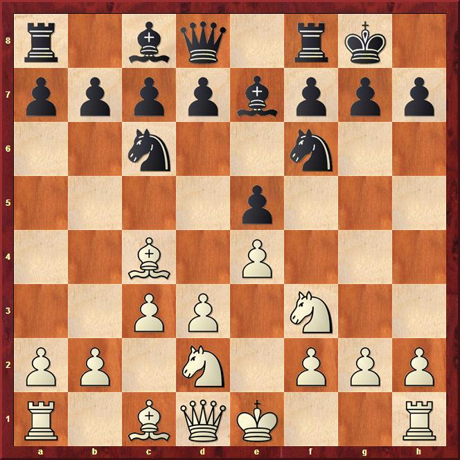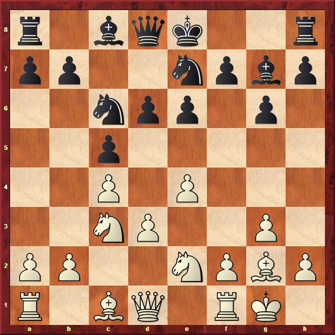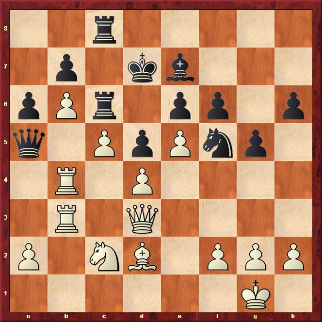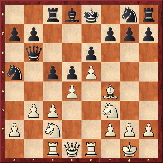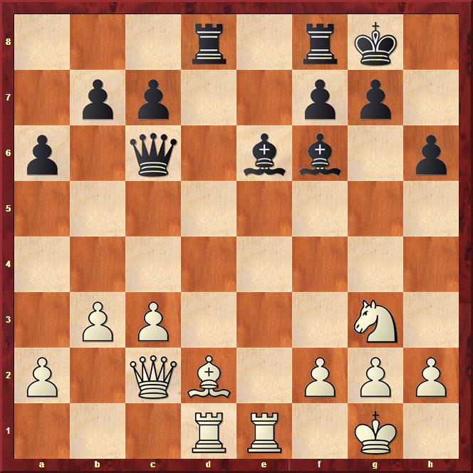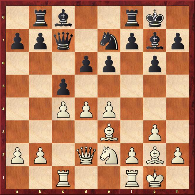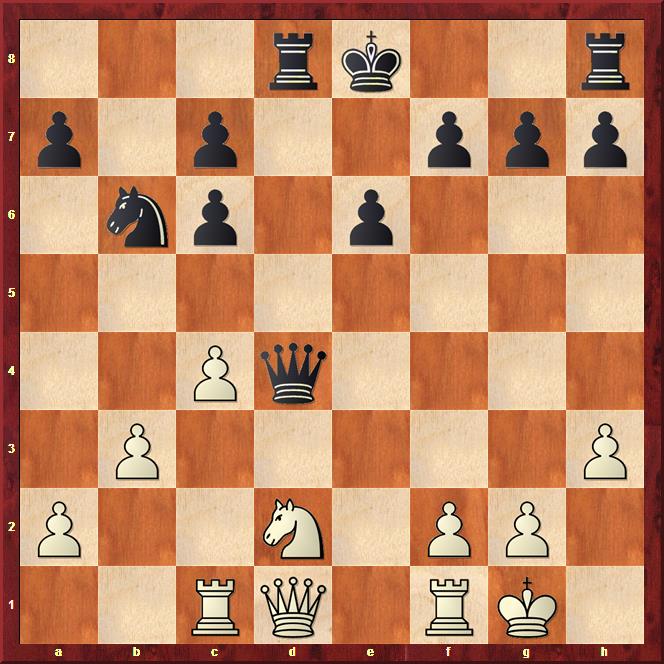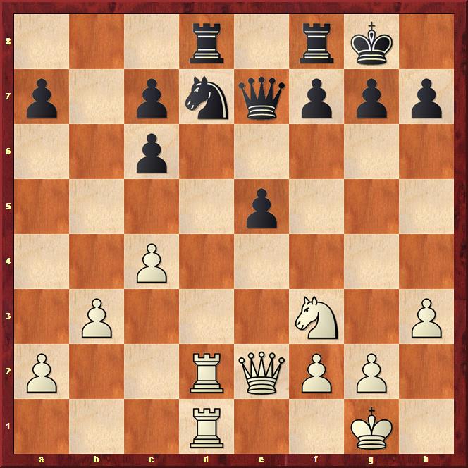 In deze stelling speelt Ilja 16. Pf3, want na dameruil blijft pion c6 zwak, bijv. 16… Dxd1 17. Tfxd1 0-0 18. Pe5. Kim speelt dan ook 16… Dc5.