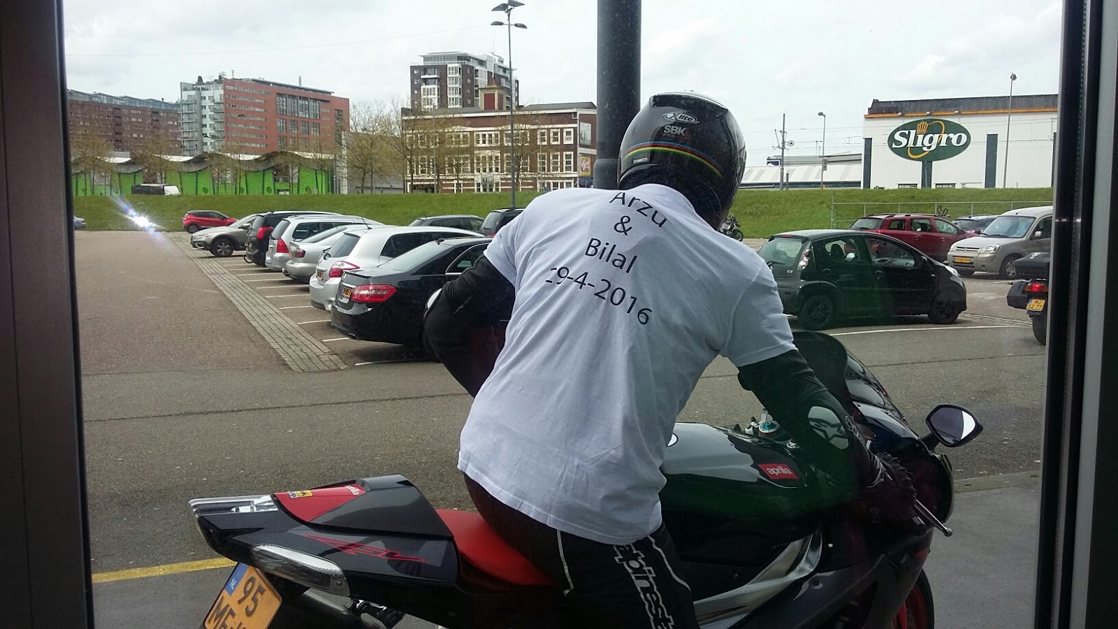 Het duurde niet lang of uit een auto, die overduidelijk ook bij de motorrijders hoorde, een pakket met witte t-shirts te voorschijn kwam. De ene na de andere motorrijder trok het witte shirt, met opdruk, over zijn leren motorkleding.