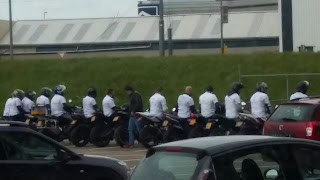 Ze laten hun motoren nog even flink ronken en niet veel later verlaten ze keurig in tweetallen, als ware het een schoolklas onder leiding van een strenge juf, de parkeerplaats.