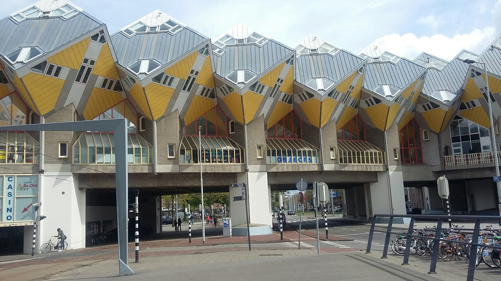 Hier hadden al wat belletjes moeten gaan rinkelen, maar dat gebeurde op een of andere manier niet. We stijgen weer op tot boven Maasniveau en nemen toch tram 8. We zitten net of Gerbrich stelt vast dat we toch die andere tram 8 moesten hebben, die de andere kant uit ging. Helemaal niet bij stilgestaan! We stappen meteen bij de volgende halte uit en reizen terug. Dan nemen we toch de metro, want dat blijkt toch te kunnen. Lindert blij. We stappen uit en blijken bij Blaak te zijn. Dat kennen we in ieder geval, van Monopoly! En als we het metrostation uitstappen, blijken daar de beroemde kubuswoningen te staan!