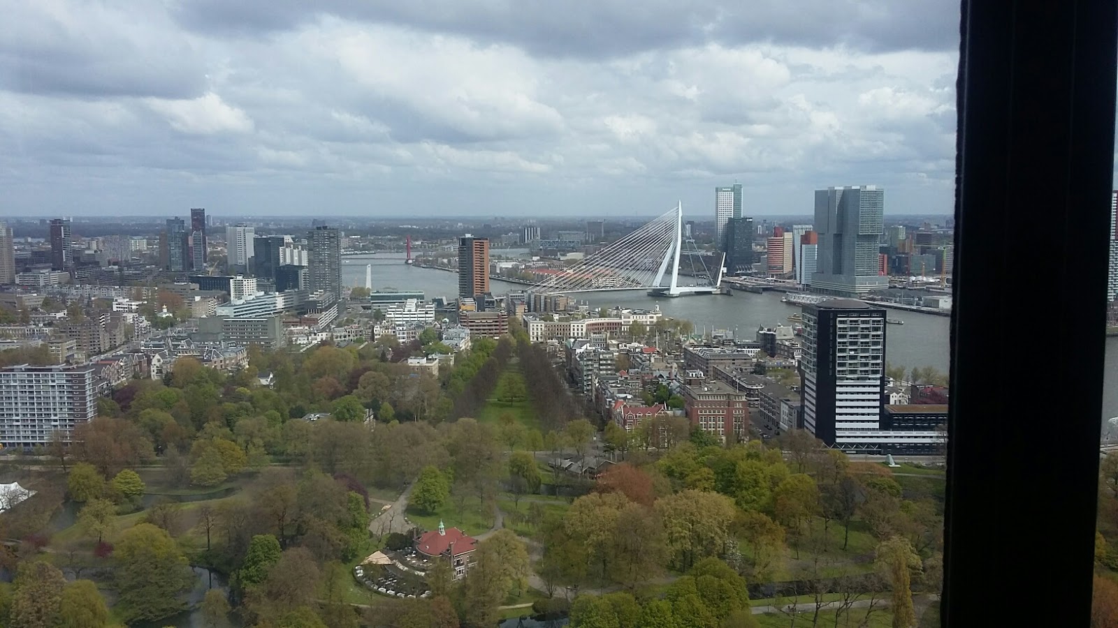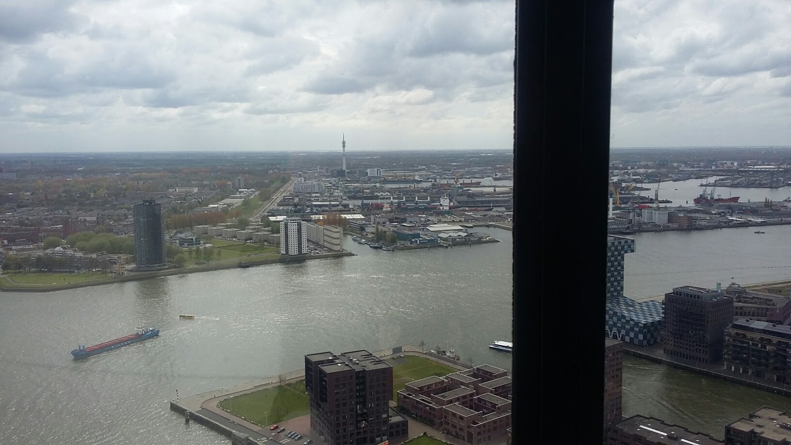 Gelukkig zijn Gerbrich en Lindert heel flexibel en gooien we het programma om. Eerst naar de Markthal, het was immers ook wel tijd om wat te eten. Hoewel erg druk was de Markthal ronduit zinnenstrelend en het was dan ook niet moeilijk iets lekkers te vinden. Met gevulde magen waagden we een nieuwe poging om met de tram bij de Euromast te komen. Nu ging het in een keer goed. Dit was goed voor ons zelfvertrouwen! Vanaf halverwege de Euromast bewonderden we Rotterdam. Vervolgens stonden we zo’n uur in de rij om het topje te bereiken.