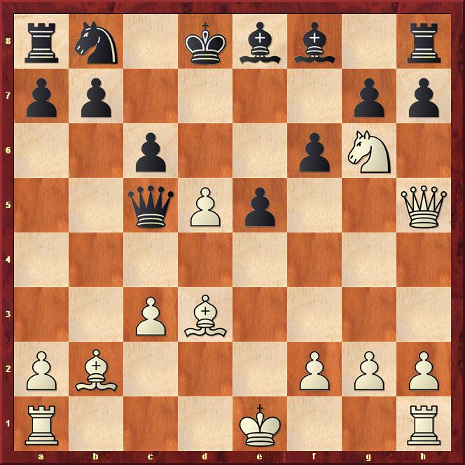 Ilja heeft zich heel goed voorbereid. De varianten rollen er ’s ochtends goed uit. Tijdens de partij haalt ze jammer genoeg twee varianten door elkaar heen, waardoor ze een achterstand in ontwikkeling heeft en haar paard en beetje verdwaald raakt op a5. Om haar paard op g8 in het spel te brengen was Ph6 wellicht een optie. Nu besluit ze tot 14… Ld8 en dat maakt de tactische wending met het ongelukkige paard op a5 mogelijk