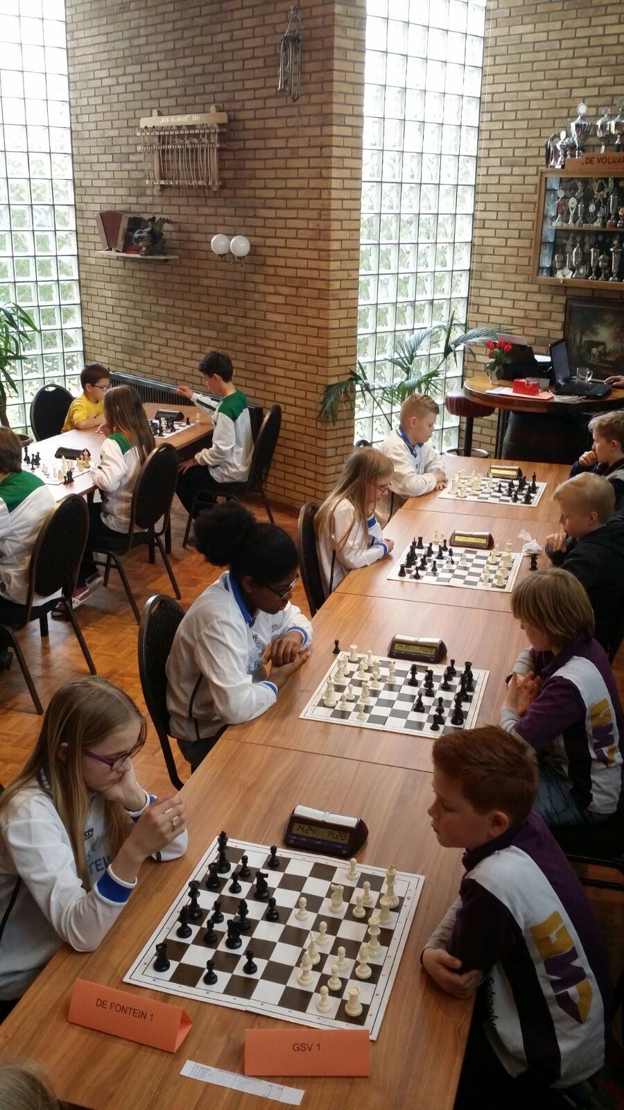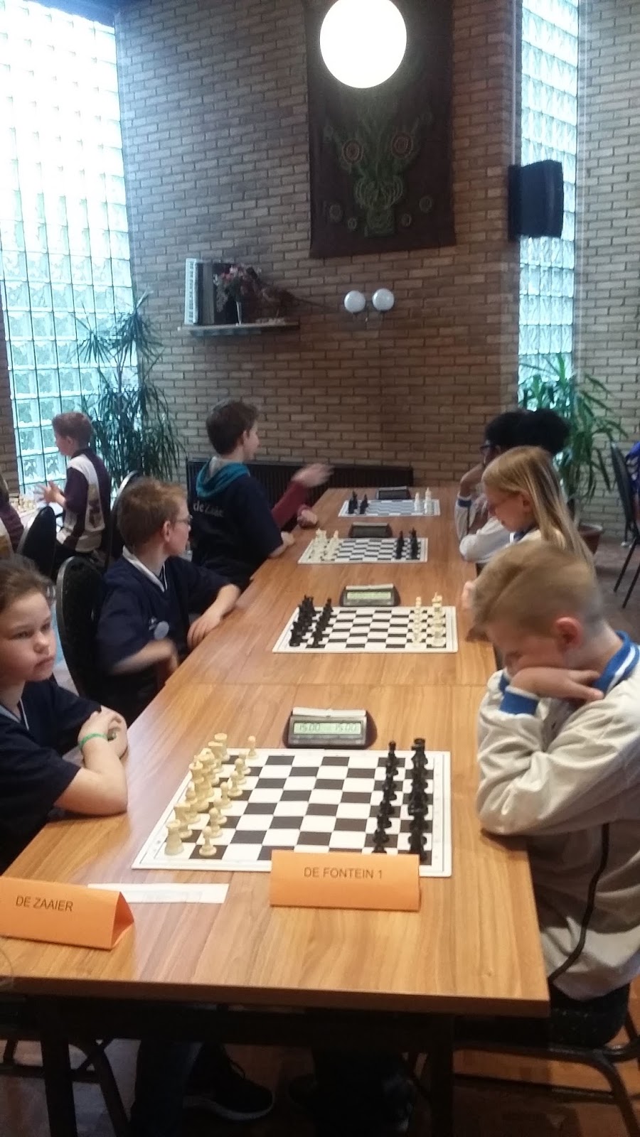 Helaas ziet ze niet hoe ze verder kan komen en gaat ze, ondanks een remiseaanbod, door de vlag. 2-2, terwijl we dichtbij de overwinning zijn geweest. Toch komt de Fontein alleen aan de leiding omdat DHC verliest van de Zaaier. Tussenstand 1. CBS de Fontein 5-7,5 2. Theo Thijssen 4-7,5 3.-7. 4 scholen met 4 matchpunten In de vierde ronde de belangrijke match tegen GSV. Achteraf de beslissende voor het kampioenschap. Vorige week verloren we nog, maar nu zijn we duidelijk te sterk.