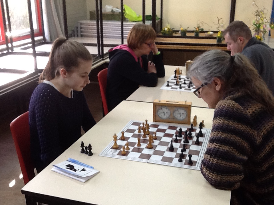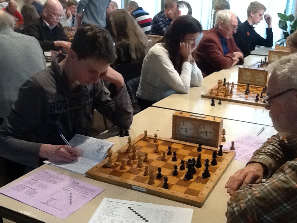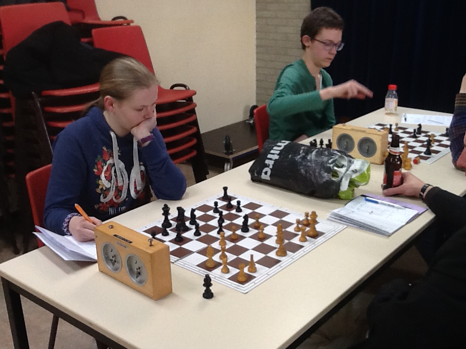 Ilja en Gerbrich speelden samen in de onderste groep. Ze mochten meteen tegen elkaar. De partij eindigde in remise. Daarna speelde Ilja goede partijen, maar geen punten, terwijl Gerbrich juist de maximale score uit enkele bedenkelijke stellingen haalde. In de zesde ronde moest Gerbrich tegen de leider van de groep, Tijmen Hofstra. Een echte Angstgegner. En nu ging het weer mis. Ze stond gewonnen maar miste in de volgende stelling een eenvoudige kans.