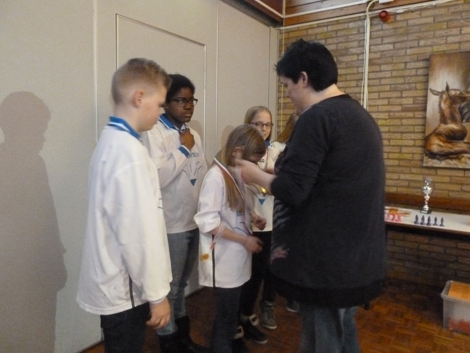 team bestaande uit één van de schoolschakers van elke deelnemend schoolteam. Eén voor één werden deze schakertjes naar voren geroepen om het naambordje van hun school op te halen én een zet tegen de burgemeester te doen. De burgemeester kon aardig schaken, want zelfs Anna-Mae wist met haar zet hem geen materiaal afhandig te maken. Na 10 zetten eindigde de partij in een gelijk spel. Rond