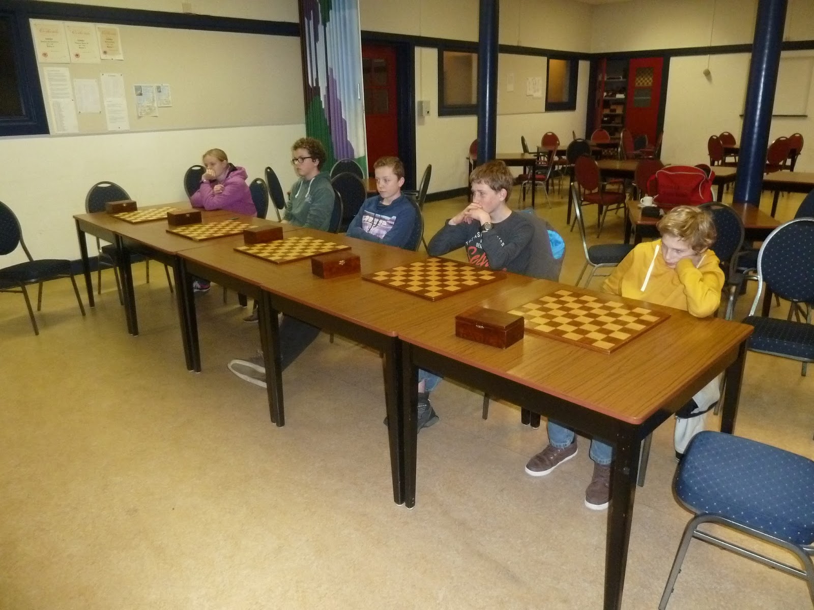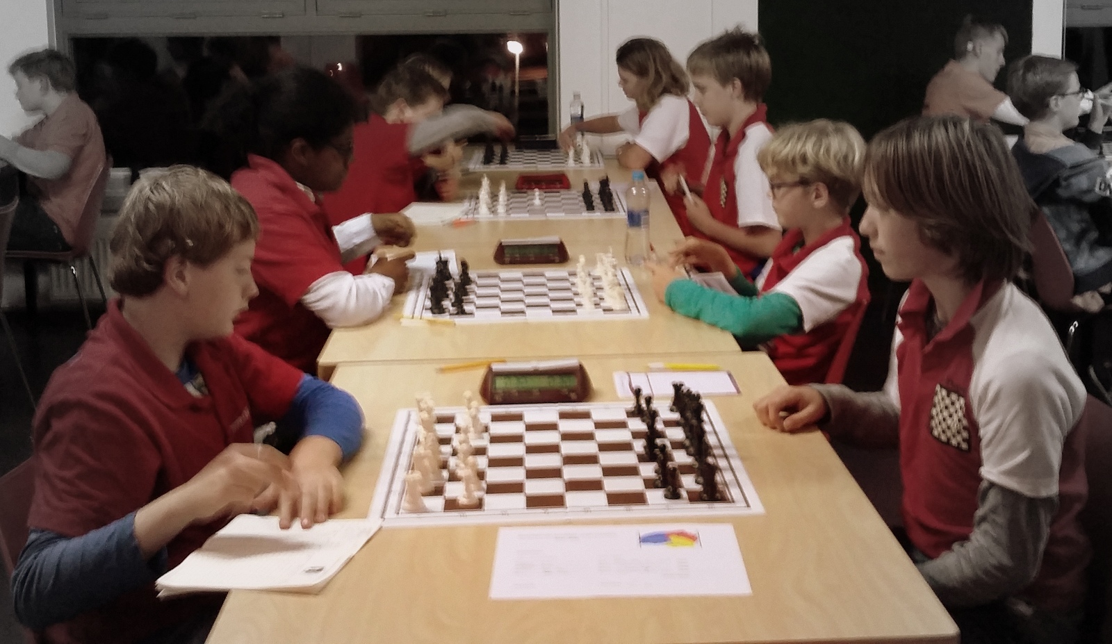 Het was een heel erg leuk team om mee op pad te zijn in de Nosbus. Joppe, Lindert, Rowin, Martijn en Anna-Mae speelden steeds meer samen als een team. Ze probeerden het zo goed mogelijk en leerden hoe je bij schaken een team kunt vormen. Daar droeg de bus zeker aan bij, maar ook het plezier in het schaken. De laatste dag was onze beste dag, want we hadden het meeste geleerd van onze eerdere dagen: Joppe en Lindert moesten als blokker zo lang mogelijk tegenstand bieden tegen veel sterkere spelers, terwijl Anna-Mae, Martijn en Rowin in de tussentijd de punten probeerden te scoren. Twee keer ging het goed, één keer mislukte het ondanks de heldenmoed van Lindert en Anna-Mae. Maar ook als het mislukt kun je trots zijn op de je prestatie, als je er echt voor bent gegaan!