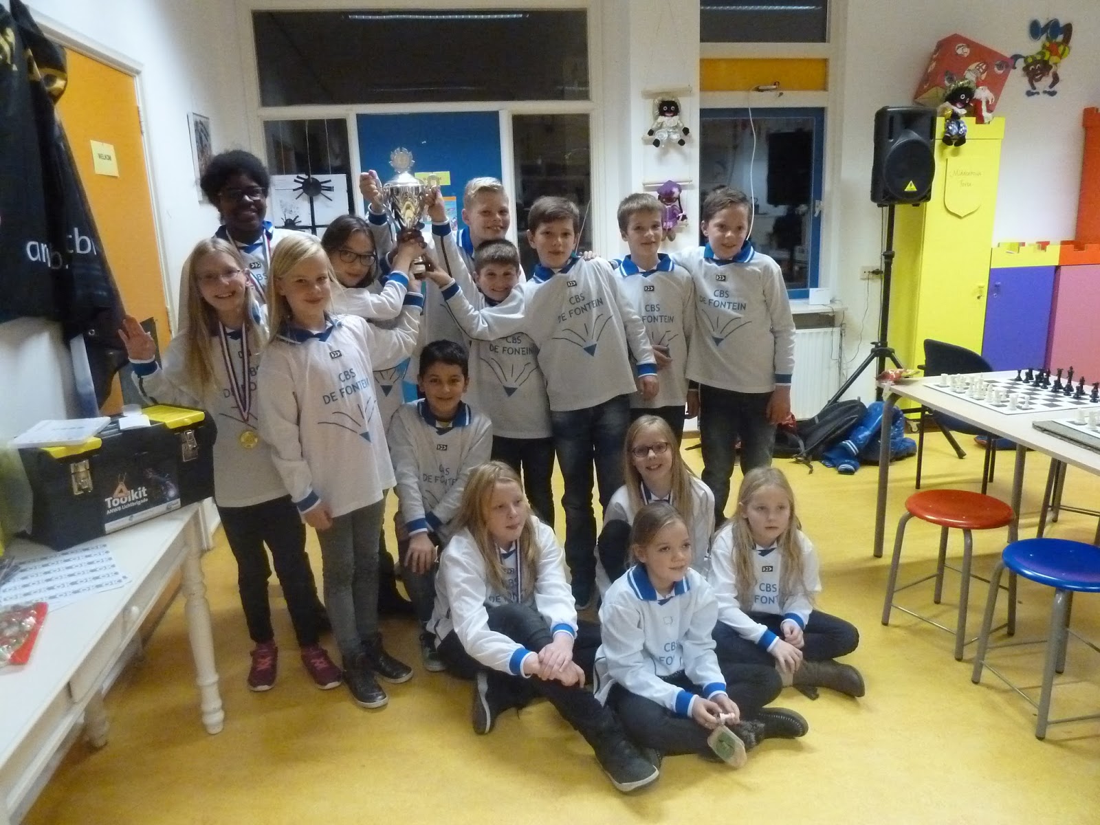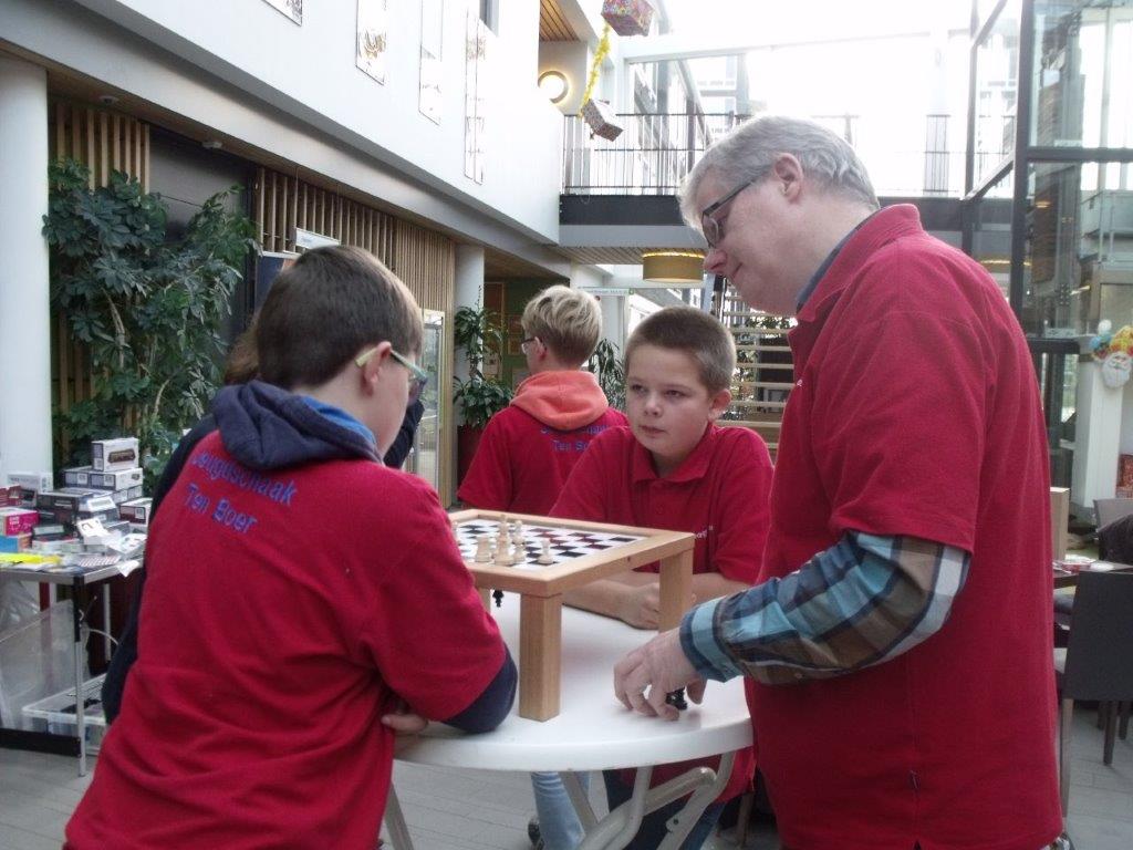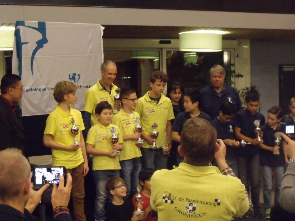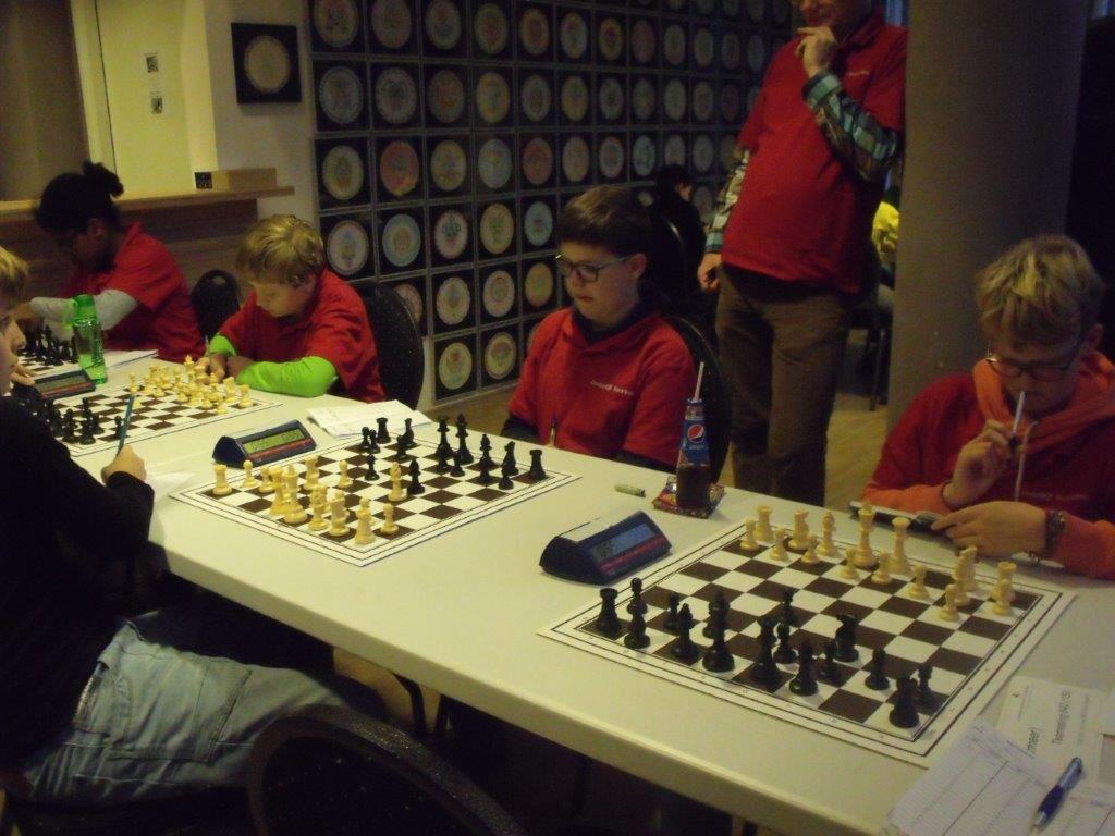Toch is de begeleiding (Erwin, Jantine, Dirkjan en Roelof) geweldig trots op dit team. Men heeft gestreden, is boven zichzelf uitgestegen. Joppe wist in de tweede ronde zijn eerste punt binnen te halen. Hiermee haalde hij het gelijke spel binnen. En nog wel door mat te zetten met zijn favoriete stuk: een loper. In elk geval was deze bisschop hem beter gezind dan de kindervriend die eerder aan ons team voorbij liep.