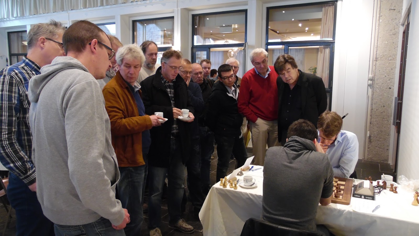 Gisteren zijn Jan en Roelof een dagje naar het grote schaaktoernooi in Hoogeveen geweest. Een interessante en leuke dag. Bijzonder waren de prijzen die Feline en Lisanne Waardenburg wonnen bij de amateurgroepen. Ook razend boeiend was het tijdnoodduel tussen Werle en Bok. Bok moest met iets meer dan 30 seconden (en 30 seconden increment) op de klok nog 12 zetten doen. Elke keer liet hij de klok tot nog luttele seconden voordat de vlag viel, lopen om dan nog een ijzersterke zet te doen. Wat een koele kikker. Jan van Os maakte de volgende foto van het tijdnoodduel, waarbij de jeugdleiders Jan en Roelof geboeid toekijken.