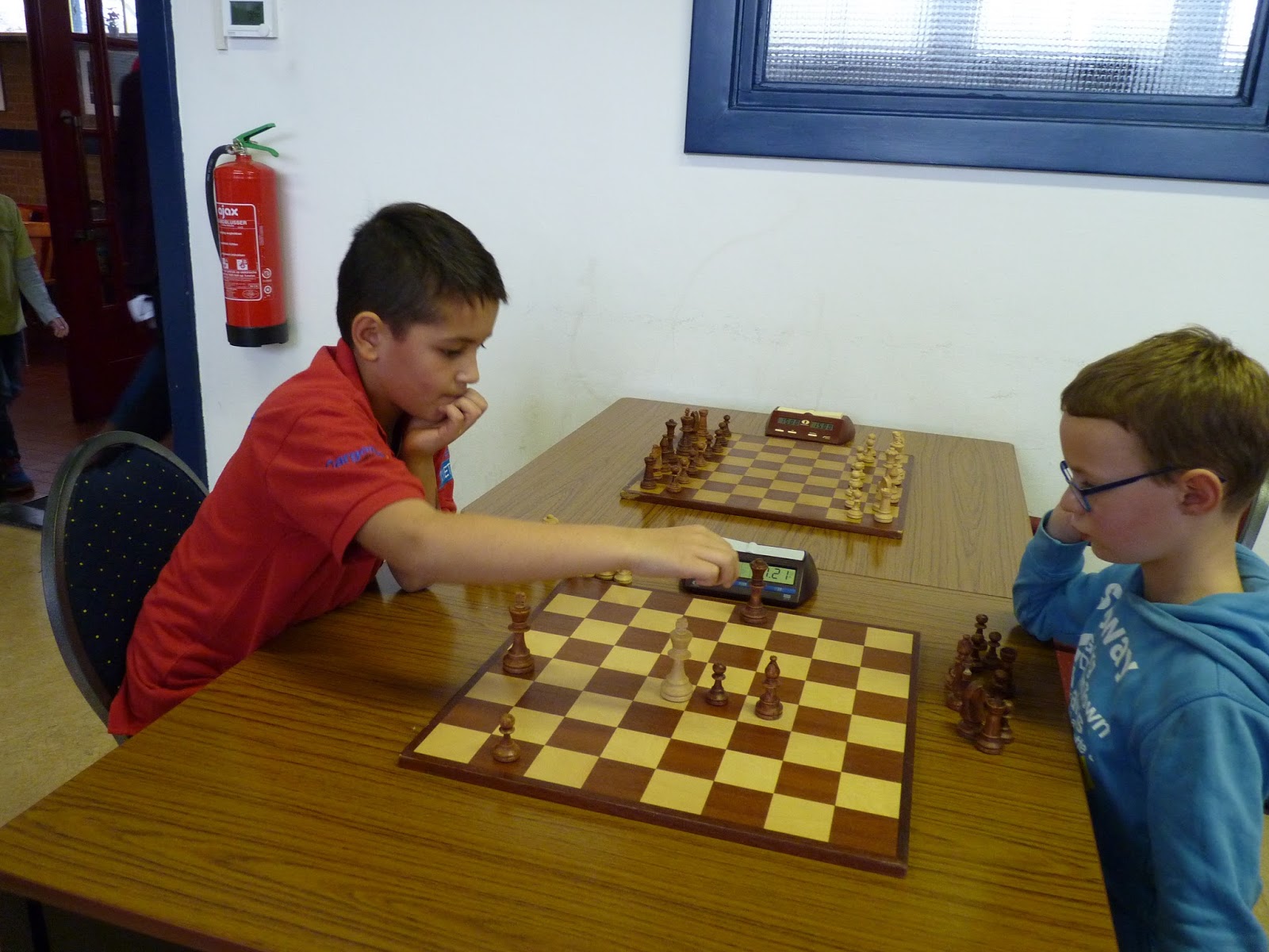Na drie ronden (lange partij, doorgeefschaak en snelschaak) staat Robin nog net voor Daan. Volgende keer gaan weggeef schaak doen.