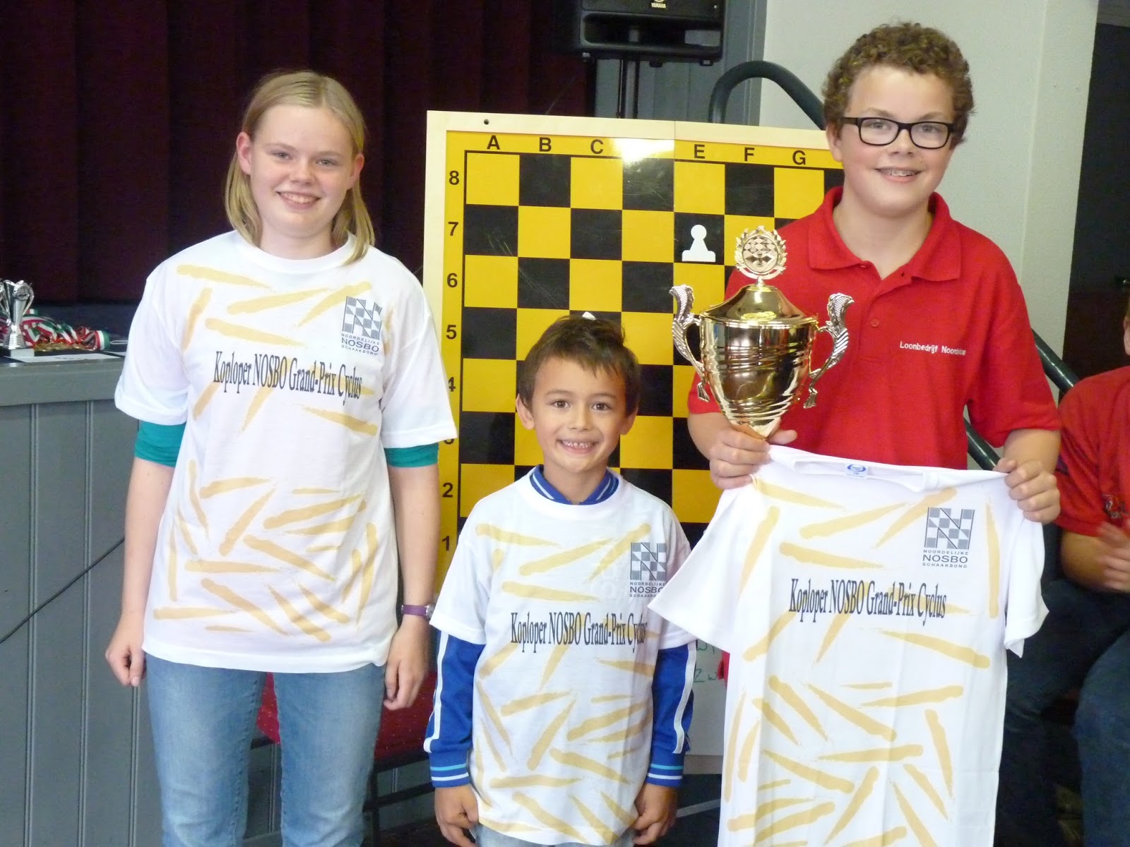Na de strijd van zaterdagmiddag blijken er drie schakers te zijn die 100% in hun groep hebben gescoord. De regel is dat de schakers uit de hoogste groep de leiderstrui krijgt. Op de vraag wat de organisatie moet doen met de andere twee leiders in het tussenklassement, besluit onze nieuwe Jeugdleider van de Nosbo, Marjet Veldhuijzen van Zanten, dat alle drie een leiderstrui krijgen. Daarom krijgen naast Daan Noordenbos, ook Gerbrich Kroon (B-groep) en David Bandstra (J-groep, SC Heerenveen) een leiderstrui.