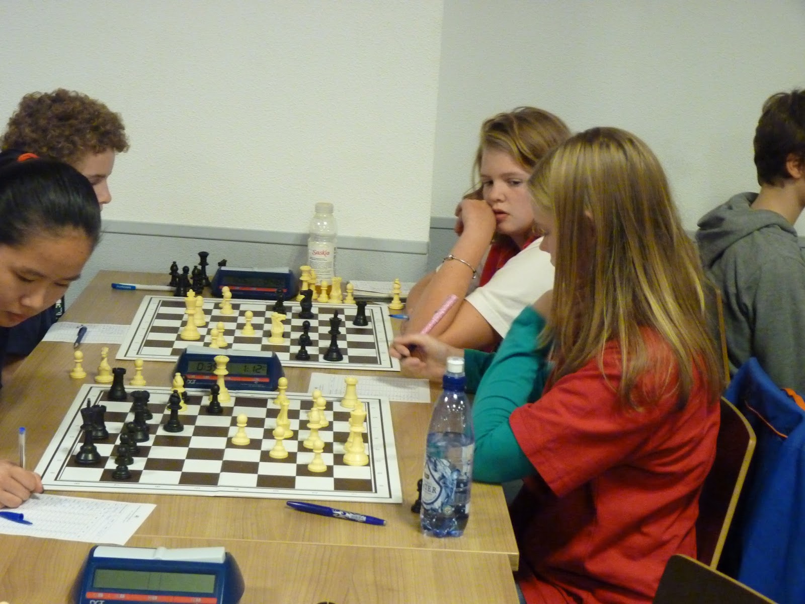 Helaas moest Daan als eerste de vlag strijken (0-1). Gerbrich speelde een goede partij tegen de Nederlandse kampioene in haar leeftijdscategorie. In de opening won ze tijdelijk een pion. Daarna kwam Ting Ting in haar spel. Gerbrich kreeg het steeds moeilijker. Hieronder een analyse van deze fase tot het eind van de partij.