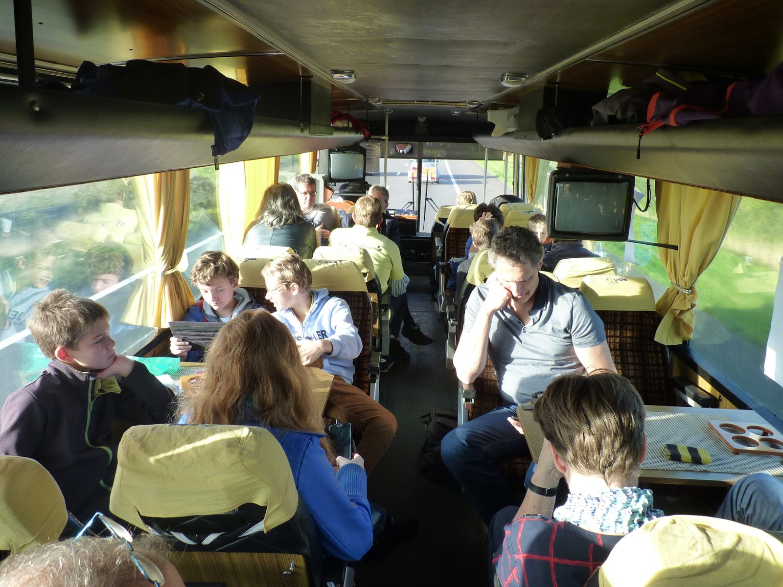 In de bus weer dezelfde buschauffeur als vorige keer. Hij is en blijft fan van onze teams vertelde hij me tijdens de dag. Verwondering en bewondering na onze vorige tocht. Geen ‘dode’ vogeltjes na een lange reis zo zei hij, maar juist een geweldig leuke en gezellige schaaksfeer op de terugreis, met geïnteresseerde gesprekken, analyses en grapjes onderling. Zijn twee broers schaakten ook, maar hij had zich er nooit zo mee bezig gehouden. Na onze vorige tocht wel!