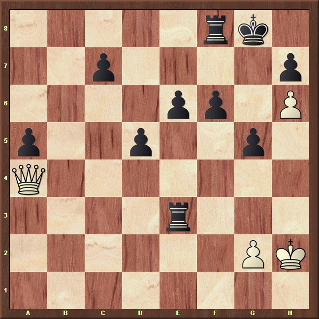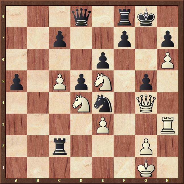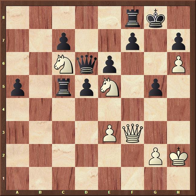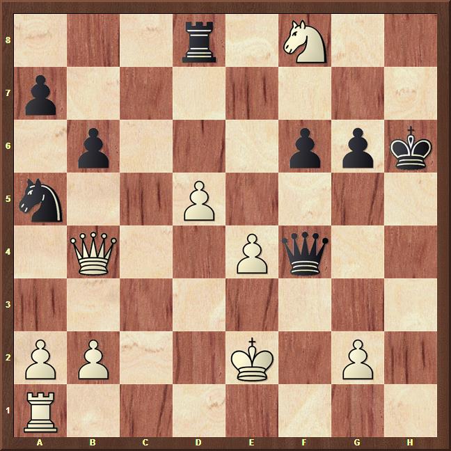 Met de 27ste zet heeft wit de zwarte aanval weer gevoed en nu mist zwart een kans. Tijdens de partij leek mij 28… Ta2 29. fxg5 (29. Le3)29… Da4 heel goed, maar wit heeft nog een verrassende verdediging die de computer gaf 30. g6 Ta1 31. g7 Tg8 32. Lxh6 Txb1+ 33. Kxb1 a5 34. Tf8+ Lxf8 35. gxf8D+ Txf8 36. Lxf8 en het is allemaal nog niet duidelijk.